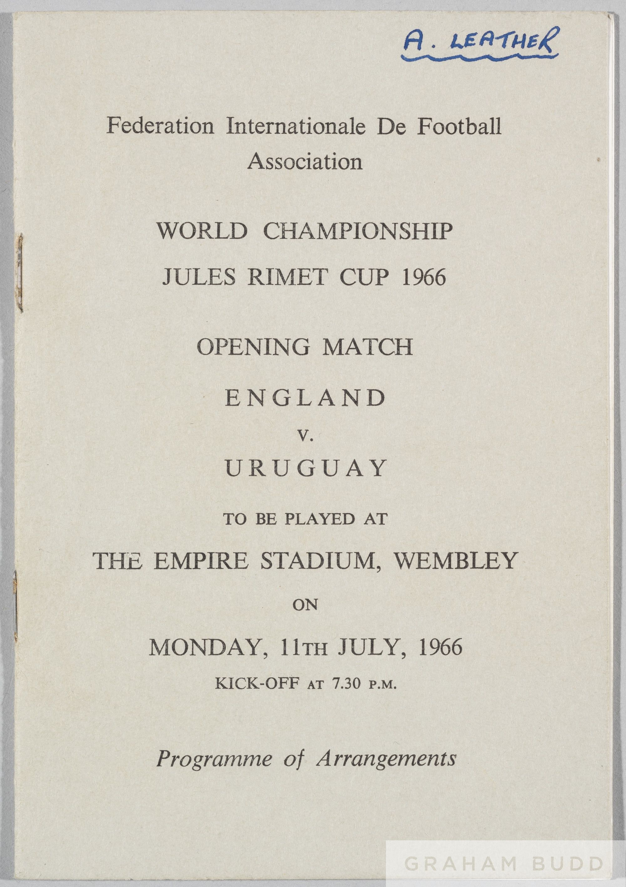 Football Association Programme of Arrangements for the Opening Ceremony and Match of the 1966 World Cup England v Uruguay, good condition other than a couple of annotations, including name to front cover