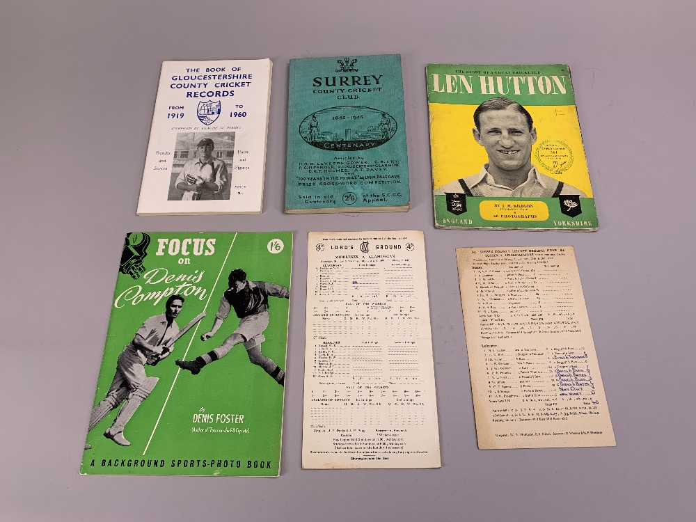 The Story of a Great Cricketer Len Hutton by J.M. Kilburn, two score cards and brochure Focus on Denis Compton by Denis Foster, Surrey County Cricket Club, 1845-1945 and The Book of Gloucestershire County Records from 1919 to 1960, (qty).