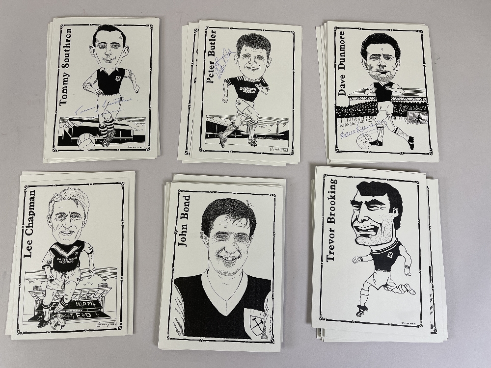 West Ham United Grey cards with caricature of players past and present by Stephen Marsh, signed 19 including Hooper, Cross, Dunmore, unsigned 43 Fenton, Brooking, Sealey, (total approx. 62)