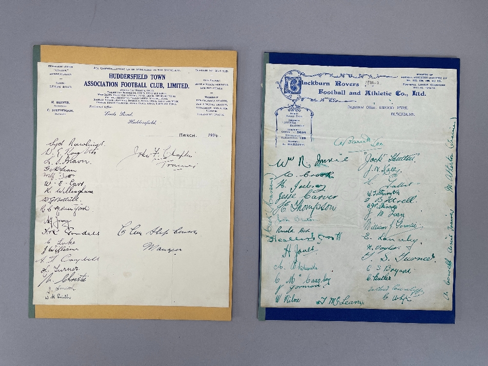 Autograph pages on club letterhead Blackburn 1932-33, 33 signatures in ink, include Crook, Carver, Dix, Jones, etc.; sold with Huddersfield letterhead dated March 1934, signed by 20 including manager and trained, separate sheet individual autographs Ted Hufton, West Ham and Jimmy Seed (3), all signatures in ink, (selection)