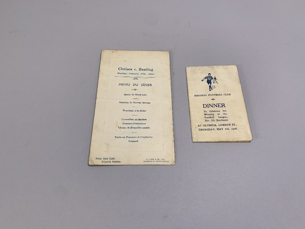 Chelsea v. Reading, single-card menu, 17th January 1921 held at Pillar Hall Cafe, Victoria Station and a Reading Football Club Dinner menu card, cel