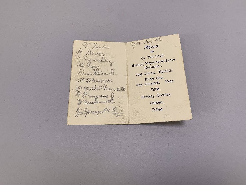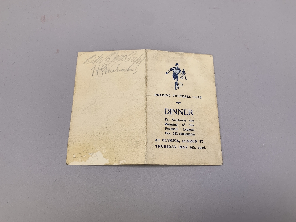 Chelsea v. Reading, single-card menu, 17th January 1921 held at Pillar Hall Cafe, Victoria Station and a Reading Football Club Dinner menu card, celebrating the winning of the Football League, Div III (Southern) held at Olympia, London St, May 6th, 1926, bearing numerous pencil autographs (2) Horizontal fold and slight staining
