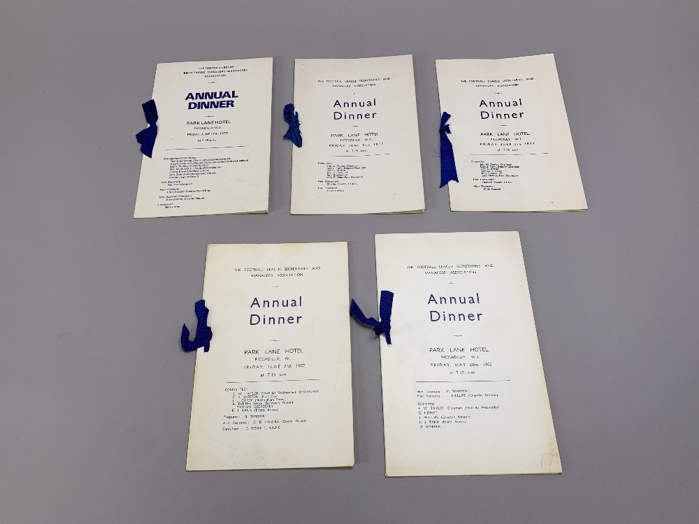 Five Football League Secretaries' and Managers Association menu cards, 1965 to 1977, comprising: 1965; 1967; 1971; 1972; and 1977 (5)