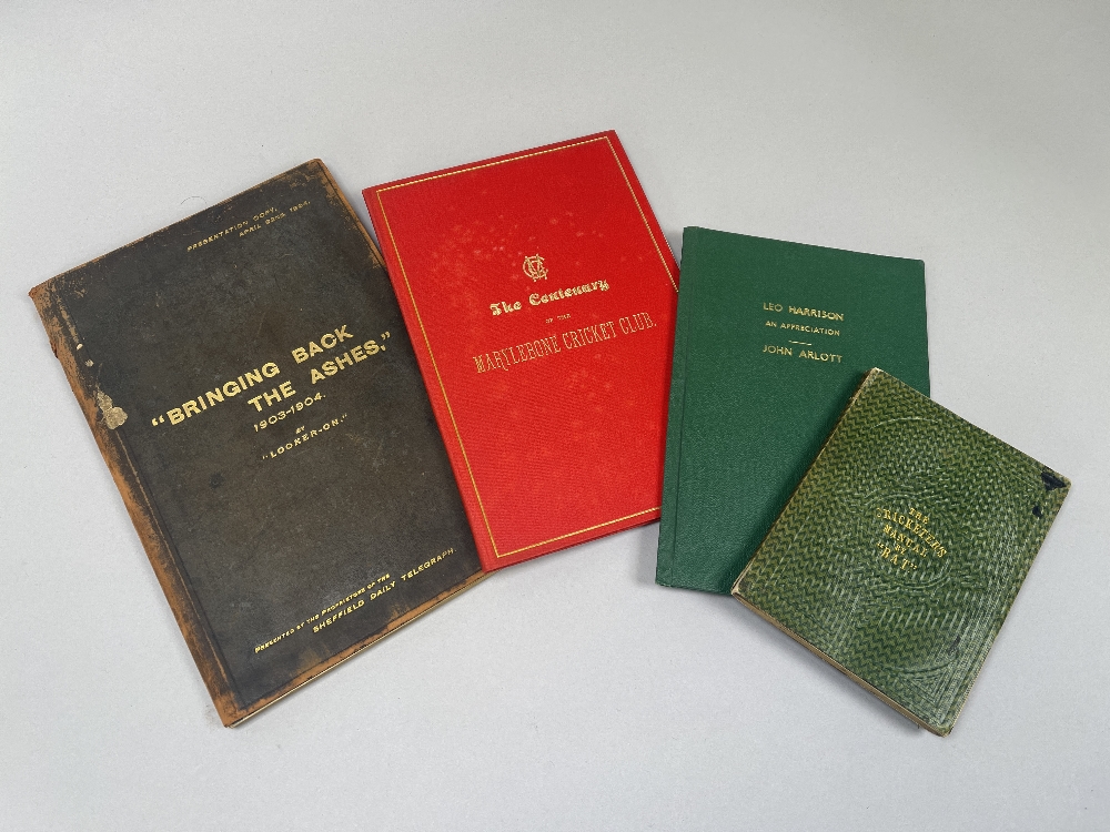 "Bringing Back The Ashes", 1903-1904 by Looker on, Presentation Copy, April 22nd 1904, published by Sheffield Daily Telegraph, The Cricketers Manuel by "BAT", Leo Harrison, An Appreciation by John Arlott, limited edition signed, 1957, The Centenary of the Marylebone Cricket Club (4)