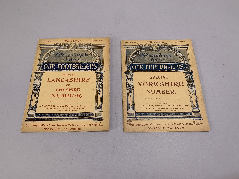 Two volumes of Our Footballers comprising Special Yorkshire; and Special Lancashire and Cheshire, late 1890s, featuring twenty-four cabinet size photographs of footballers, published by A D Jones, Ludgate Hill, London, each in good condition, slight wear to exterior of covers (2) Publications consistent with age