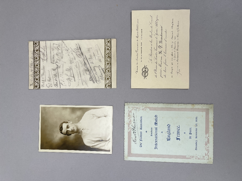H.P. Hardman collection Amateur International v France, played in Paris on 1st November 1906, players itinerary signed to front by Hardman plus menu with his name to the front and signed to front and reverse by 28 players of both teams; sold with dinner invitation and postcard of Hardman, (4)