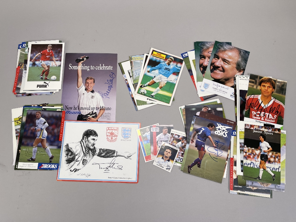 Collection of autographs English/UK players, circa 1980s, on colour Walker print cards, include Venables, Dixon, Sheringham, Pallister, Gascoigne, Seaman, etc., (80)