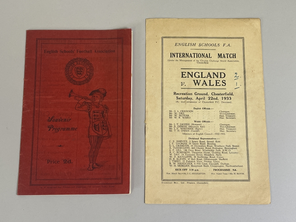 An England v. Wales, English Schools Football Association match programme, 22/4/33, match played at Recreation Ground, Chesterfield and England v. Wales, English Schools Football Association match programme, 4/5/35, match played at The County Ground, Crabble, Dover (2) 1933 programme signs of horizontal and vertical folds, score written in ink and on team page with attendance noted, 1935 programme signs of horizontal and vertical folds