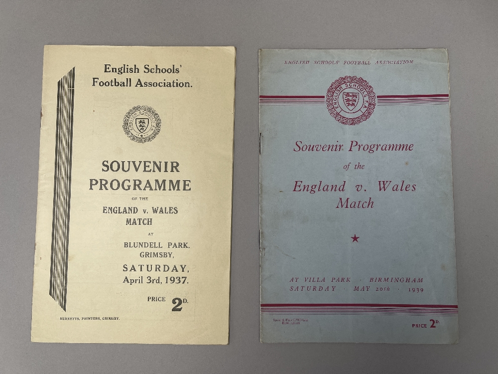 An England v. Wales, English Schools Football Association, match programme, 3/4/37, match played at Blundell Park, Grimsby and England v. Wales, English Schools Football Association, match programme, 20/5/39, match played at Villa Park (2) 1937 programme shows signs of fold and yellowing, 1939 programme signs of fold, creases and slight staining