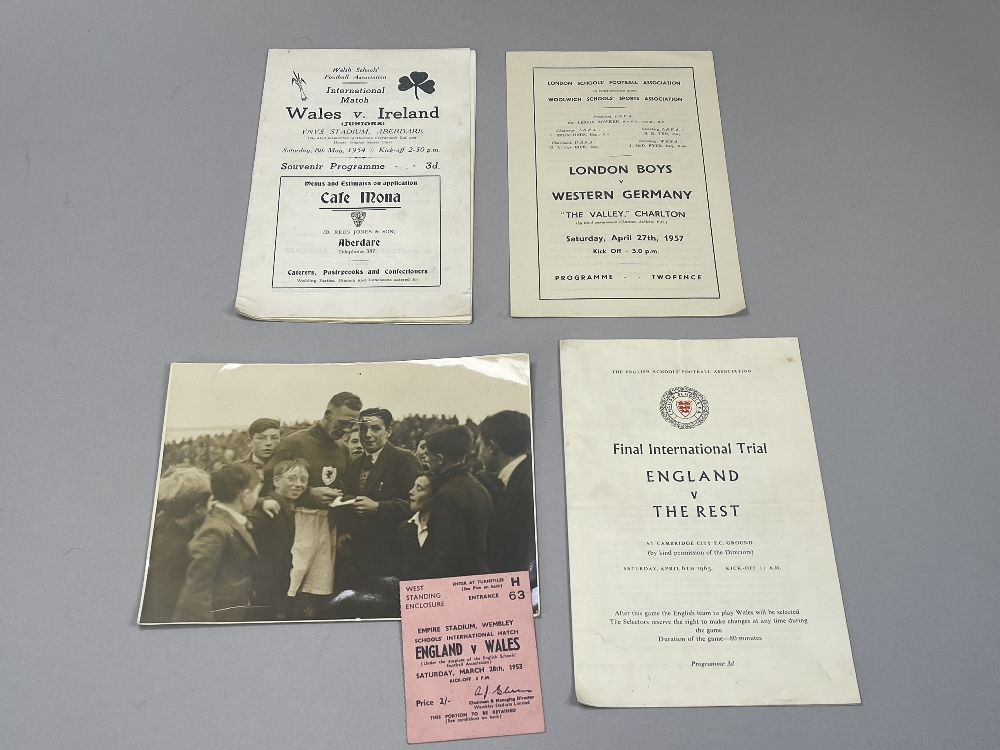 Three Schools Football Association match programmes, 1950s comprising Wales v. Ireland, Welsh Schools Football Association, match programme, 8/5/54, match played at Ybys Stadium, Aberdare; London Boys v. Western Germany, London Schools Football Association, match programme, 27/4/57, match played at "The Valley", and England v. The Rest, 6/4/63, match played Cambridge City F.C. Ground, England v. Wales, Schools International ticket stub, 28/3/53, match played at Wembley and black and white photograph of Welsh player, date unknown (5) All programmes show signs of folds