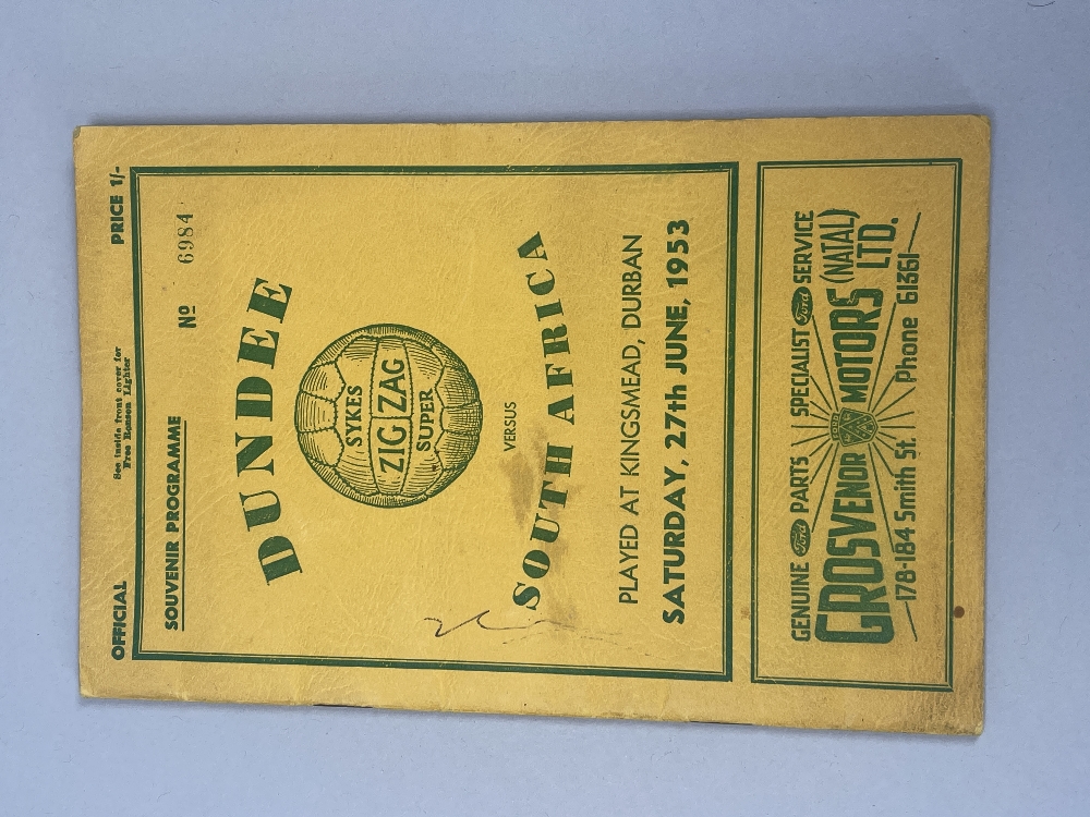 A South Africa v. Dundee tour match programme, 27/6/53, match played at Kingsmead, Durban Covers stained, pen marks on front cover