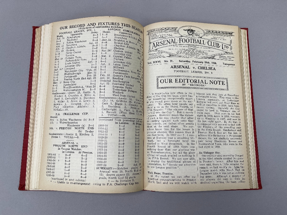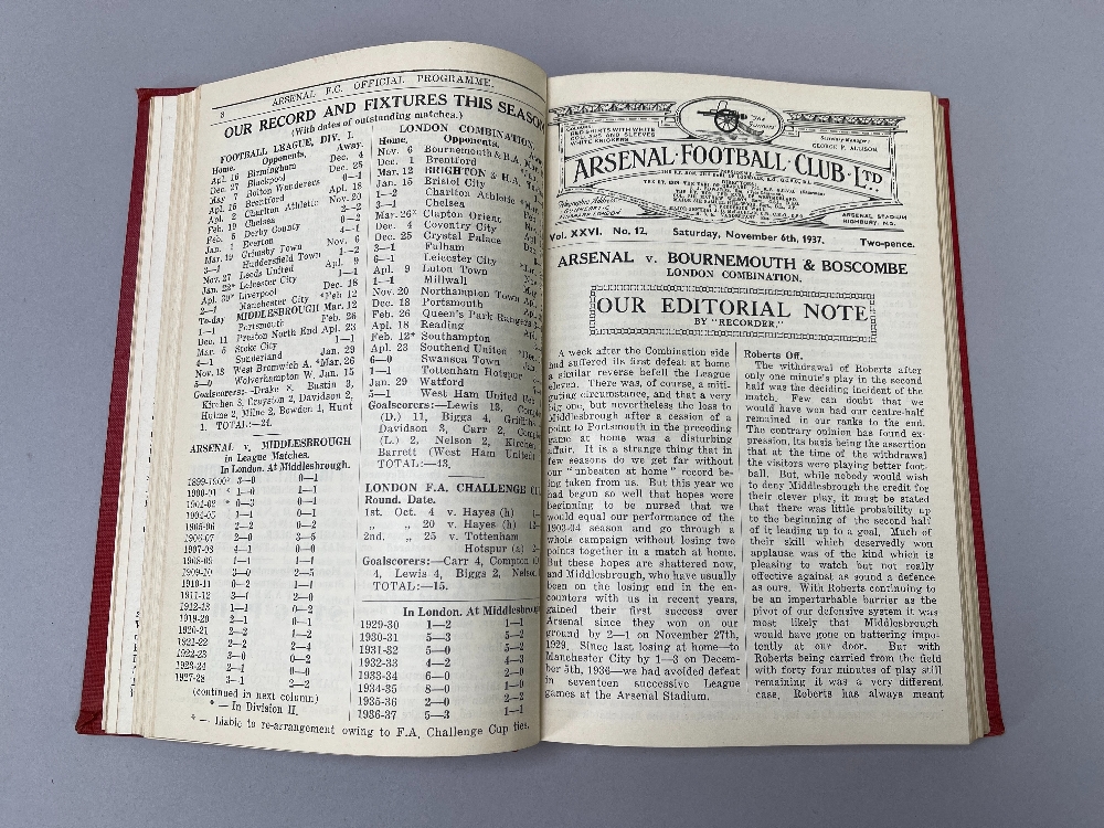 Bound volume of Arsenal home match programme, 1937-38 Championship winning season, Vol. XXVI, No.1, Swansea Town, 28th August 1937 to Vol. XXVI, No.