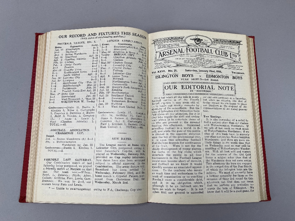 Bound volume of Arsenal home match programme, 1937-38 Championship winning season, Vol. XXVI, No.1, Swansea Town, 28th August 1937 to Vol. XXVI, No.44, Bolton Wanderers, 7th May 1938 with season ticket application, including Oxford v. Cambridge, 8th December 1937, Islington Boys v. Edmonton Boys, Star Shield, 3rd Round, 22nd January 1938, including combination and F.A. Cup, lacking No.26 postponed Leicester match, lacking covers (37) Programmes generally in fair/good condition