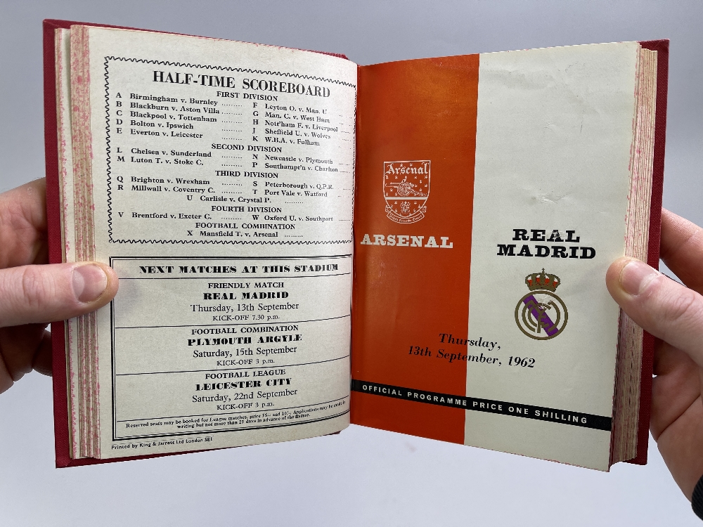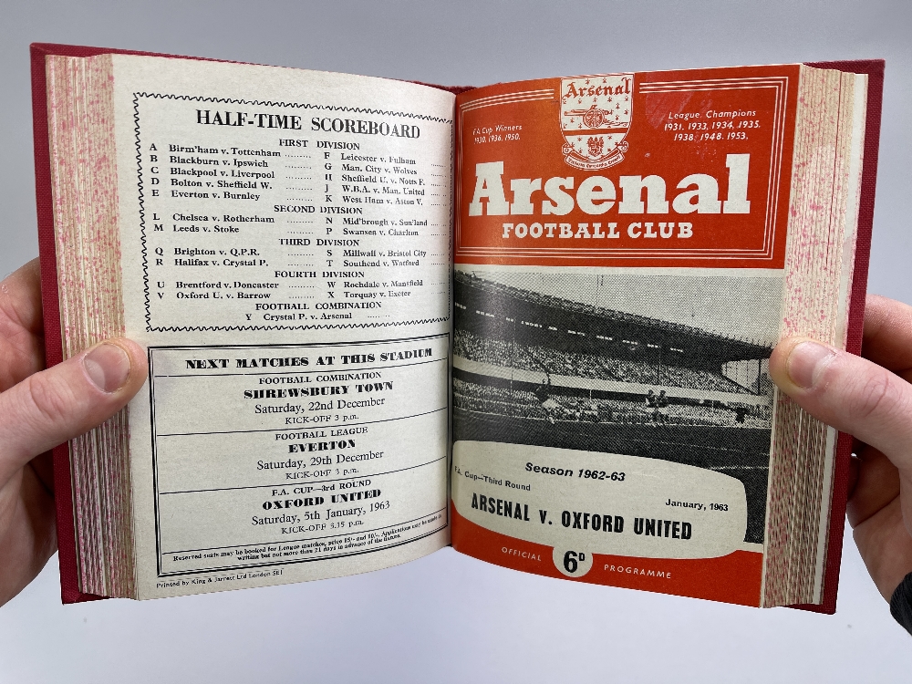 Bound volume of Arsenal home match programmes, 1962-63 Vol. XLIV No.1 Birmingham City, 21st August 1962 to Vol. XLIV No.28 Rangers, 20th May 1963 including league, F.A.Cup also including Real Madrid, 13th September 1962, Oxford United, January 1963 (26) Programmes generally in good condition