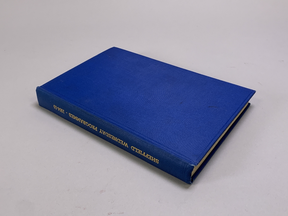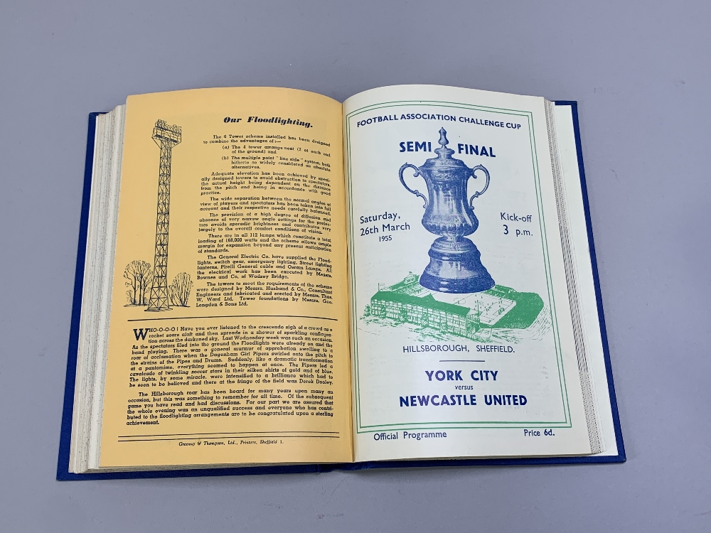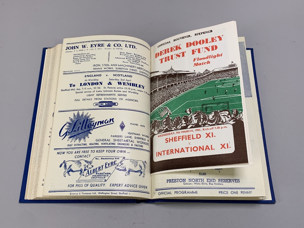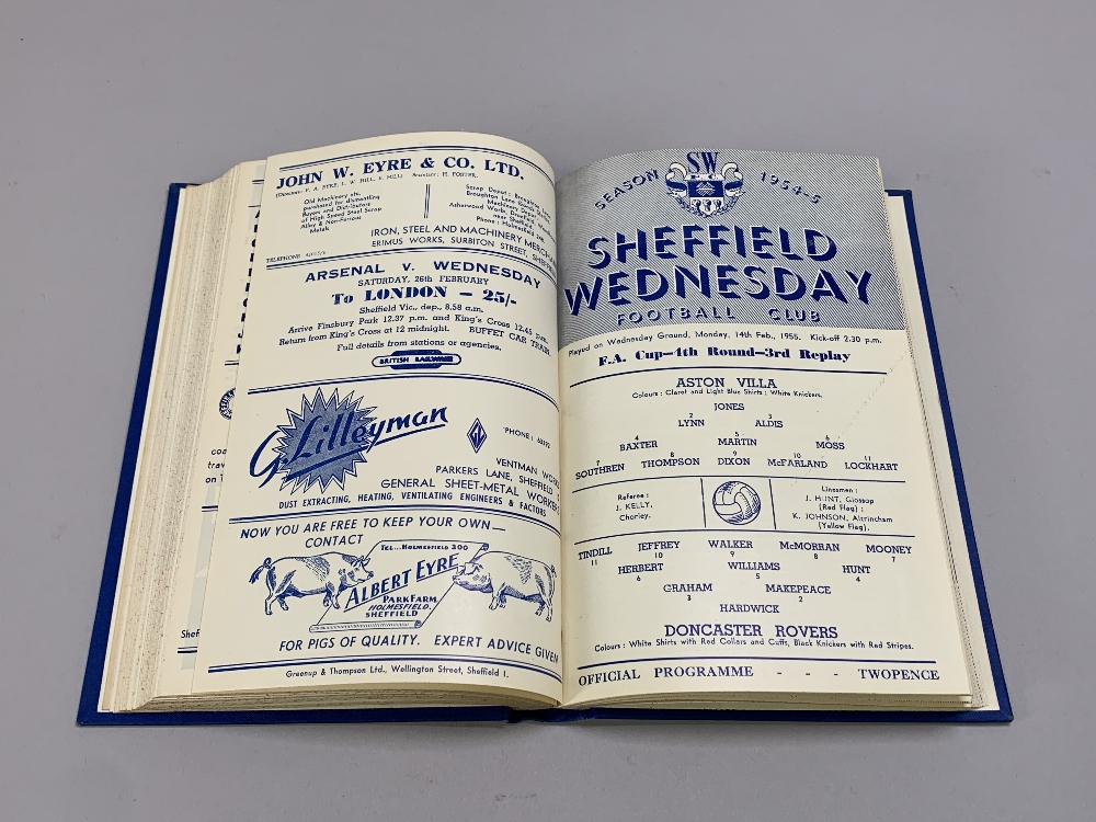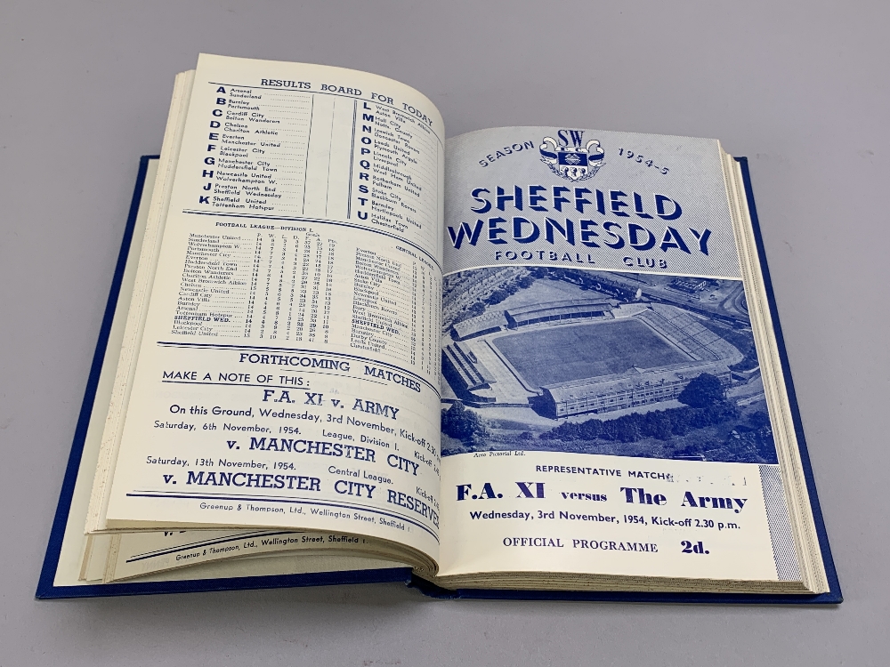 Bound volume of Sheffield Wednesday home match programmes, 1954-55 from 21st August 1954, Sheffield Wednesday Reserves v. Liverpool Reserves to 14th May 1955 Sheffield Wednesday v. Rotherham United, County Cup Final, also including league, reserves, F.A. Cup and other matches held at Hillsborough, F.A.XI v. The Army, 3rd November 1954, Aston Villa v. Doncaster Rovers, F.A.Cup-4th Round-3rd Replay, 14th February 1955, Sheffield XI v. International XI, Derek Dooley Trust Fund, 9th March 1955, England v. Germany 'B' International, Floodlight match, 23rd March 1955, York City v. Newcastle United, F.A. Cup semi-final, 26th March 1955 (50) Volume overall in very good condition