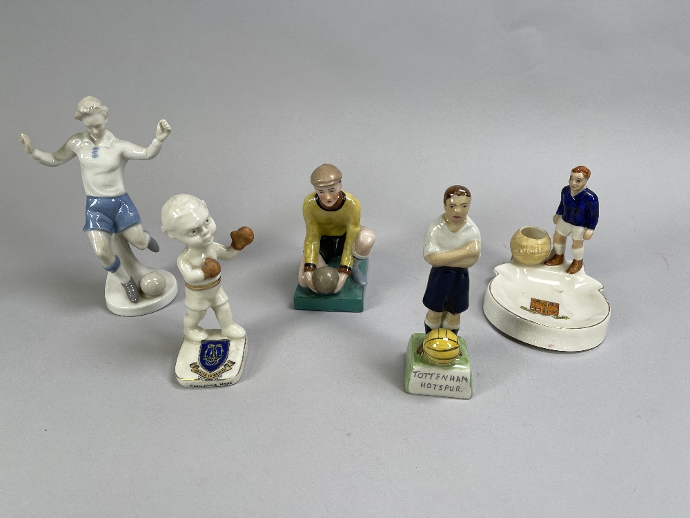 A crested Arcadian ash tray and match holder modelled as a Chelsea footballer, a continental figure of a footballer, another ceramic figure of a footballer in Tottenham Hotspur colours, 16cm high and smaller and a Shelley china figure of a boxer (5)