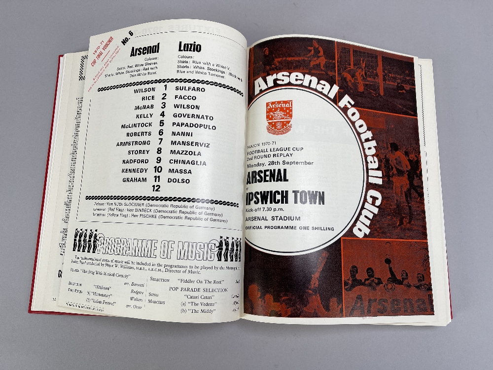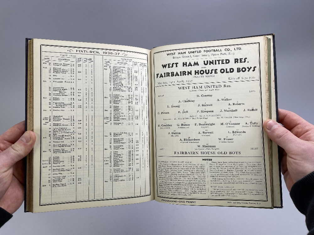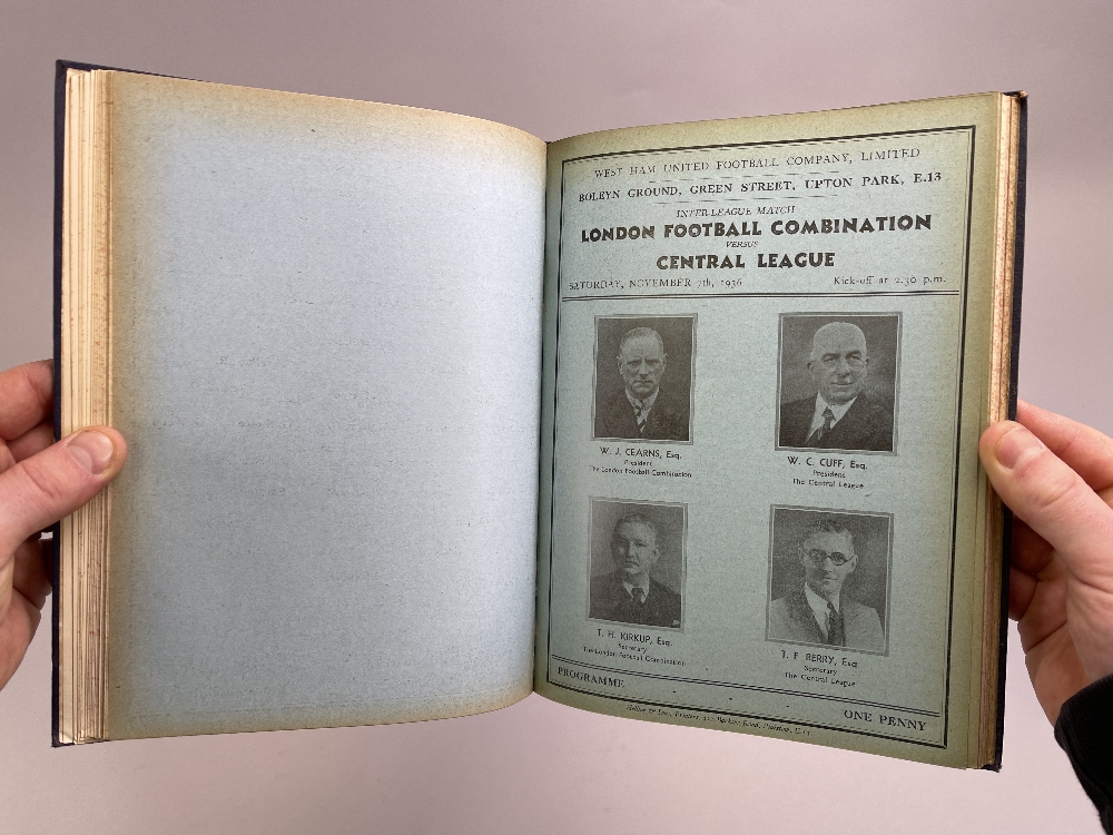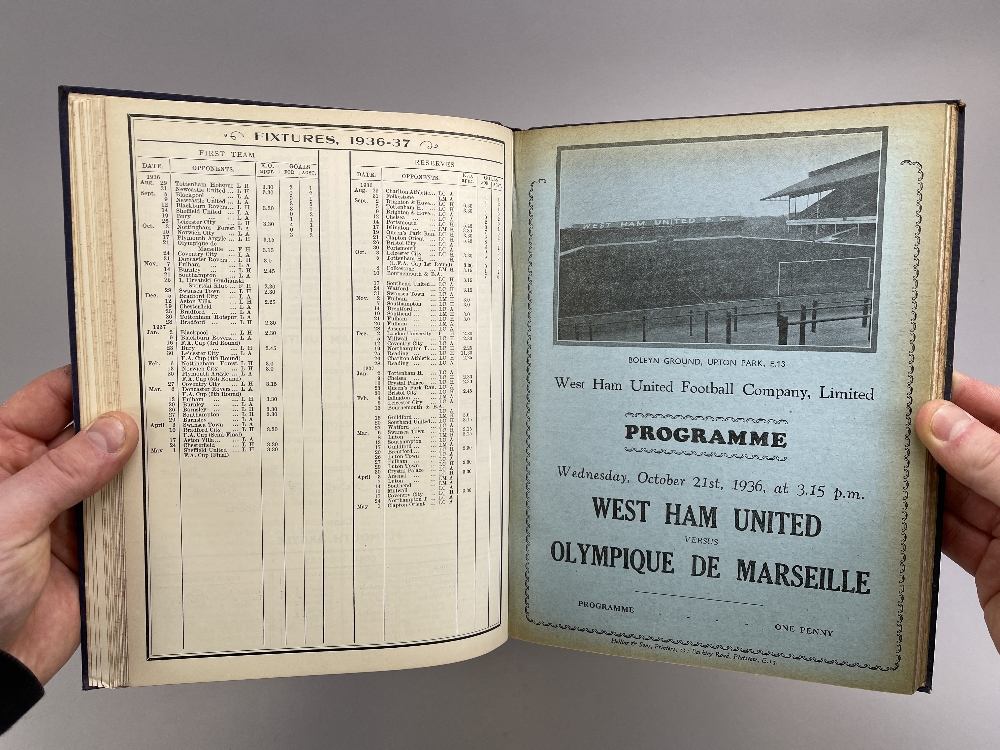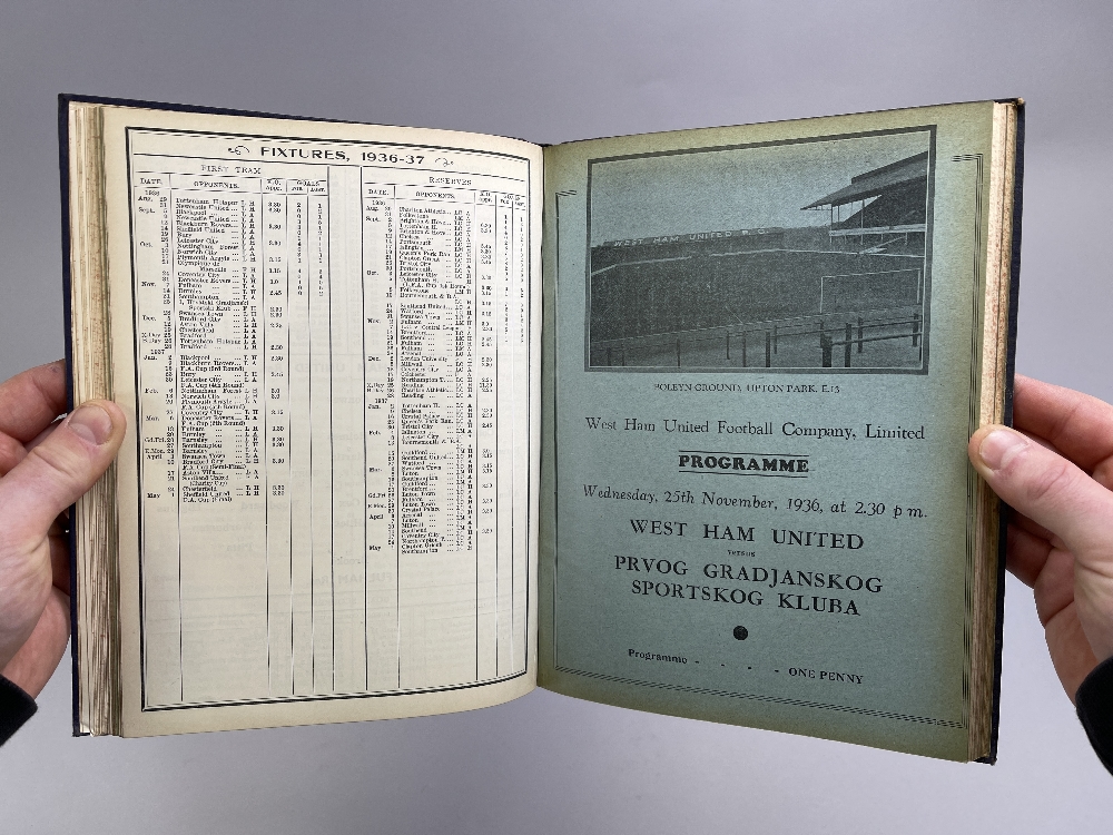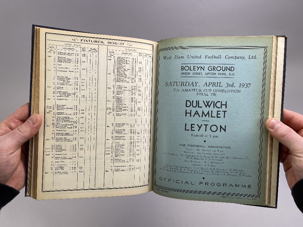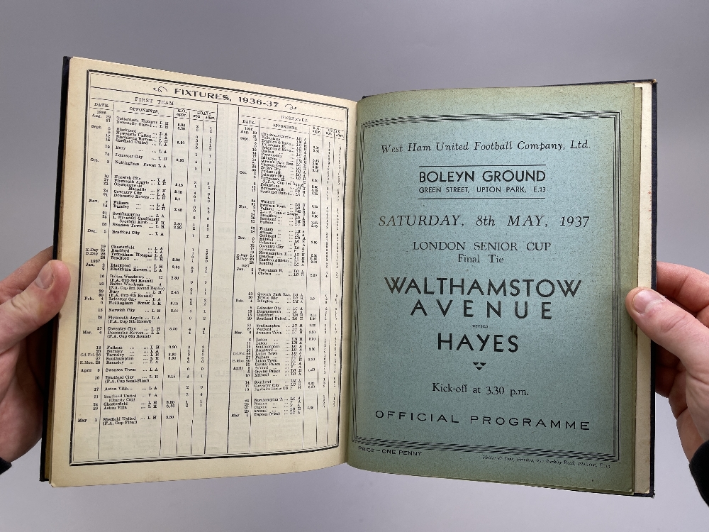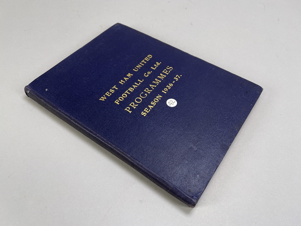 Bound volume of West Ham United home match programmes, 1936-37 from Reds v. Blues, 15th August 1936 to Walthamstow Avenue v. Haynes, London Senior Cup, final, 8th May 1937 including league, F.A. Cup, single-sheet reserves and West Ham United v. Olympique De Marseille, 21st October 1936, London Football Combination v. Central League 7th November 1936, West Ham United v. Prvog Gradjanskog Sportskog Kluba, 25th November 1936, Dulwich Hamlet v. Leyton, F.A. Amateur Cup Competition Final Tie, 3rd April 1937, West Ham United Res v. Fairbairn House Old Boys, single-sheet charity match, 19th April 1937 in original covers with gilt-tooled text (58) Programmes generally in good condition
