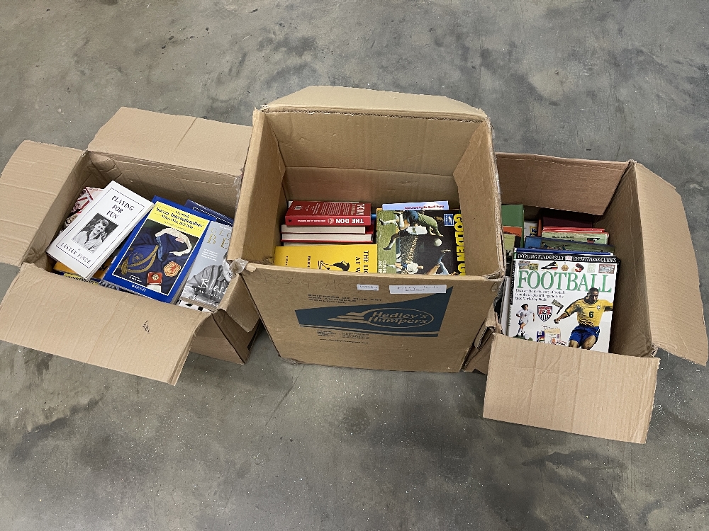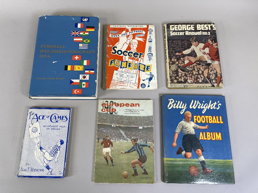 Collection of post-war football books, publications of an older vintage including 1954 World Cup Official Report complete with d/j, 'Spotlight on football' by Peter Doherty, Sam Bartram's football autobiography, Alec Whitcher's 'The Ace of Games', George Best Soccer Annual, Soccer Fanfare, 1963 European Cup, (3 cardboard boxes)