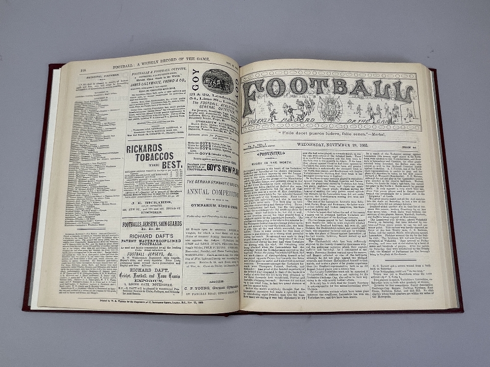 Scarce bound volume of Football: A Weekly record of the game, being vol.1 for season 1882-83, published at "Football Office", 17 Paternoster Square, London EC, including an index page for the content, 424-pages, content including Association Football and Rugby Football, answers to correspondence, regional coverage, correspondence, FA Cup, articles and essays, match lists, principal matches including internationals and cup finals and county matches, etc., in a modern hardback binding Good condition
