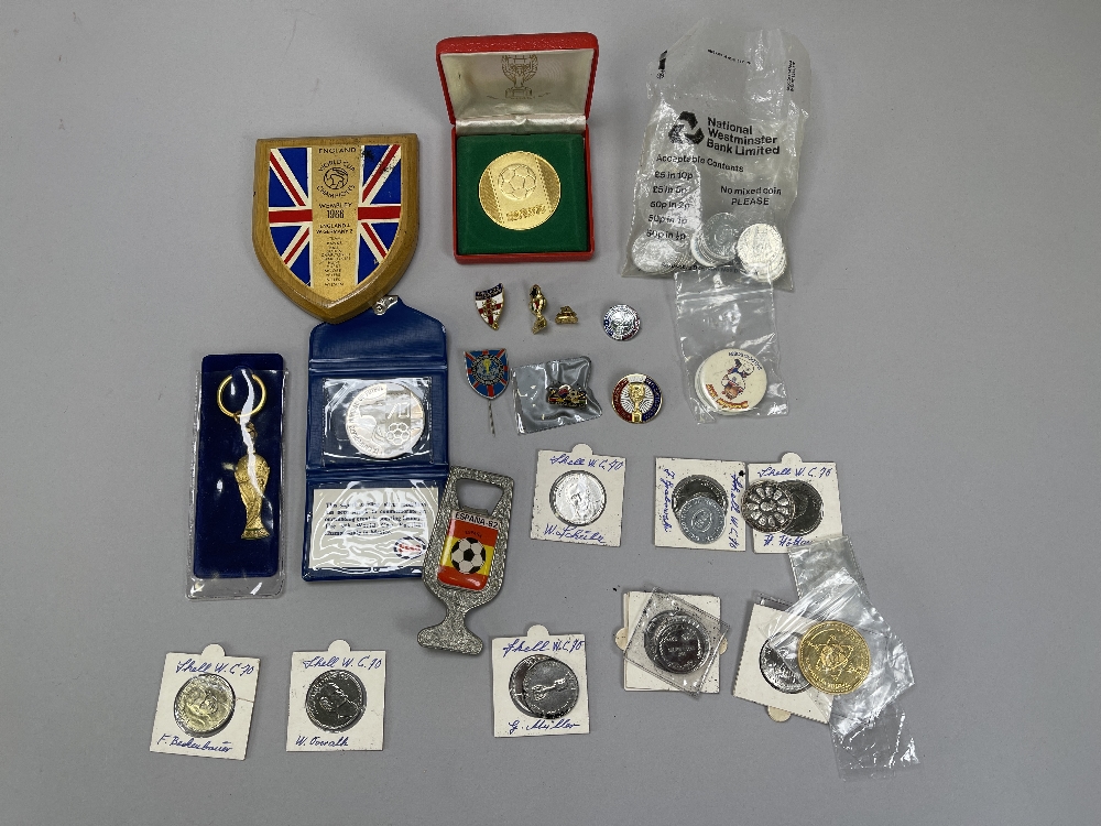 World Cup selection 1966 onwards, includes badges, coins, key rings, medallions, etc., 1966 pin badges, 1970 Mexico Esso coin in wallet, 1974 gold me