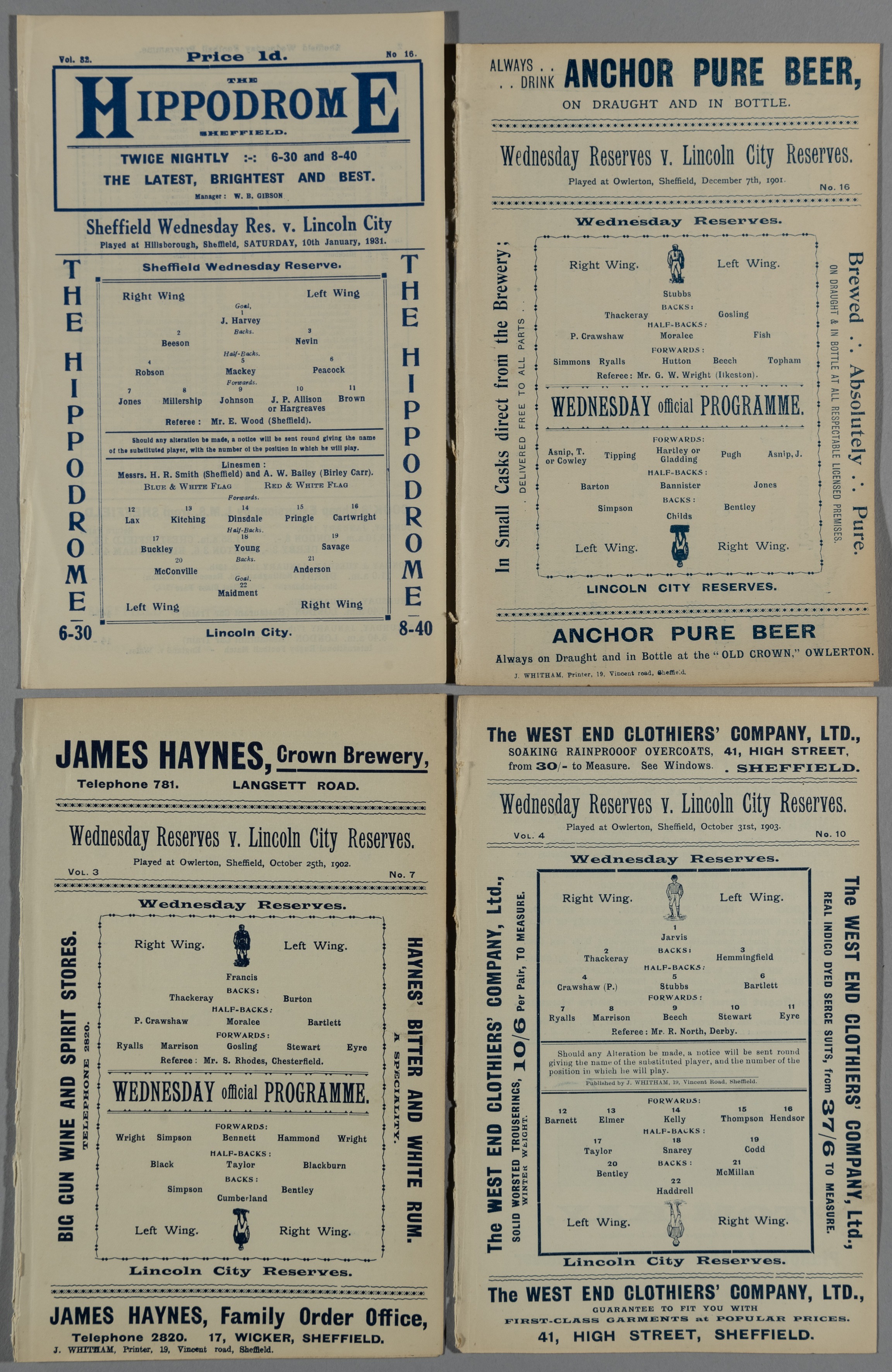 Four Sheffield Wednesday Reserve v. Lincoln City Reserve match programmes, comprising 7th December 1901; 25th October 1902; 31st October 19013; and