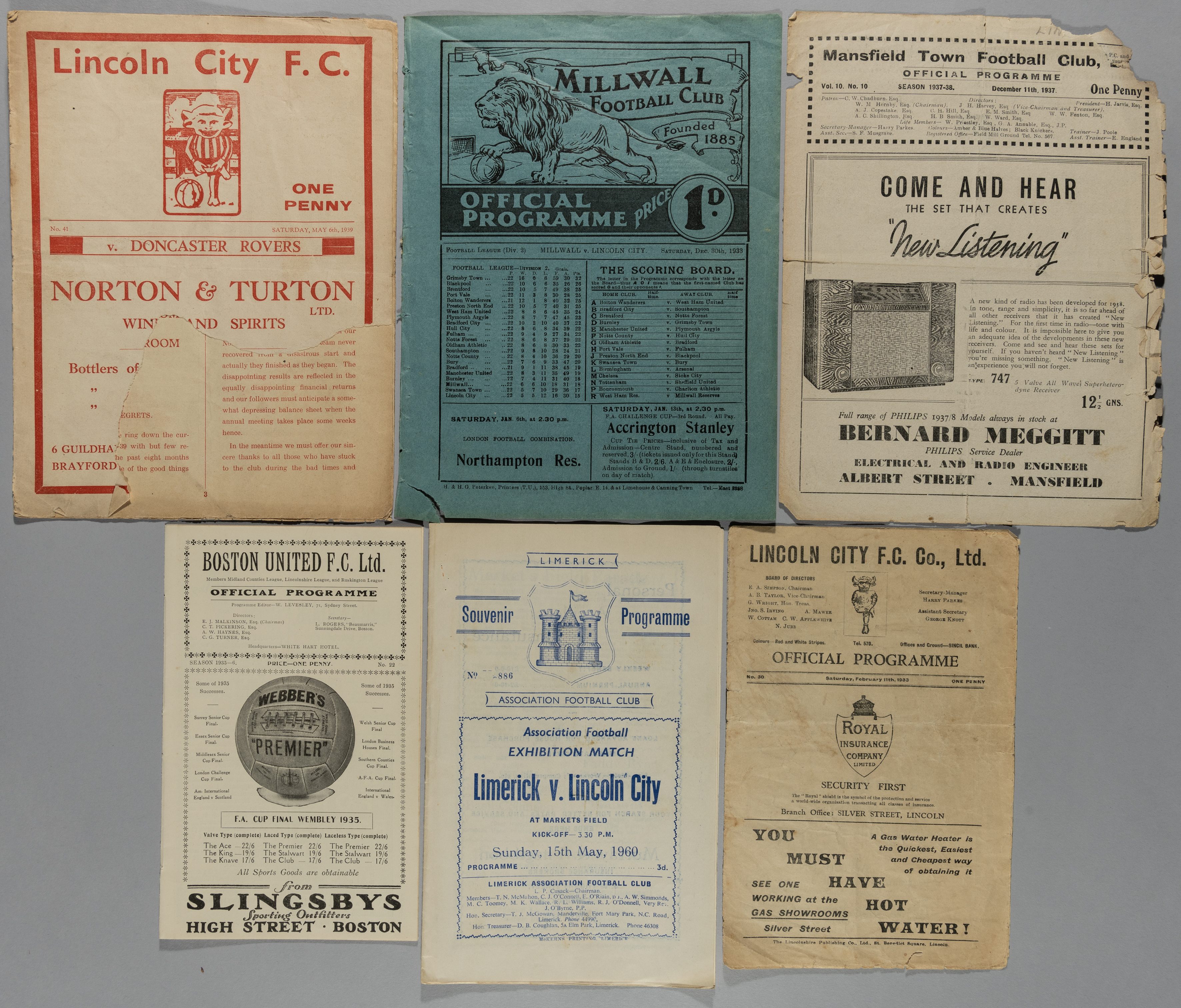 Six Lincoln City home and away match programmes 1933-1960, comprising Millwall, 30th December 1933; Grimsby Town Reserves, 11th February 1933; Doncaster Rovers, 6th May 1939, half of front cover lacking; Boston United, 25th April 1936; Mansfield Town, 11th December 1937; and Limerick, Exhibition Match, 15th May 1960 (6) Programmes in fair/poor condition