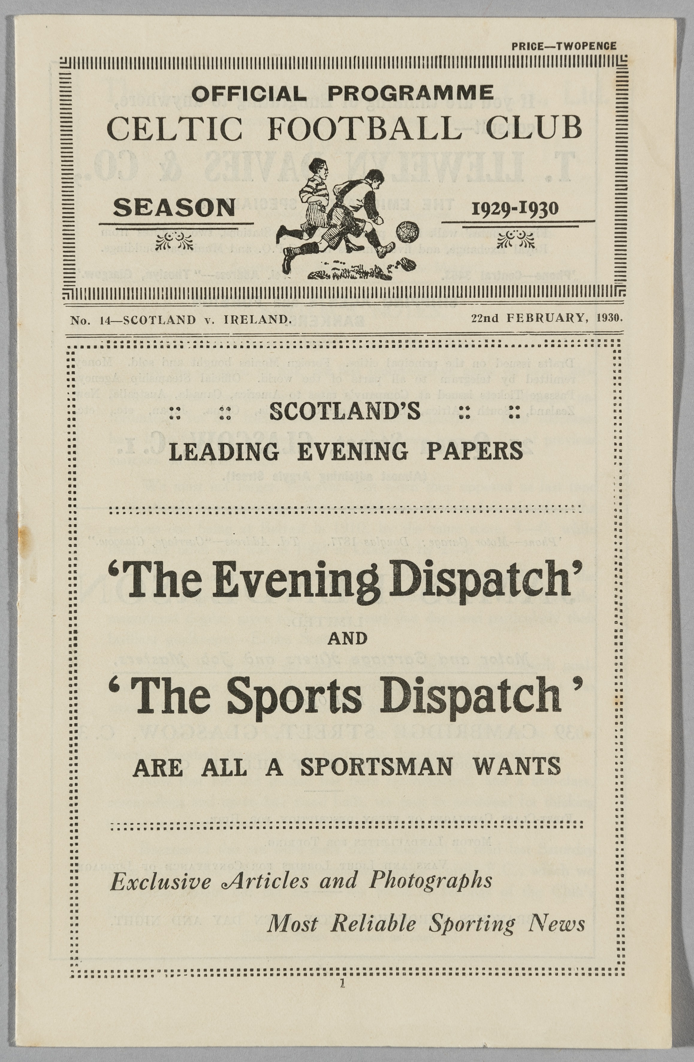 Scotland v Ireland season 1929-30 programme, match played at Celtic Park on 2nd February 1930, issued official programme Celtic Football 1929-30, this pre-dates Celtic programmes. The programme issued on 14th December 1946 v Clyde was thought to be their first issue, however this issue is clearly an official programme of Celtic FC, bearing Celtic fixture list and league tables