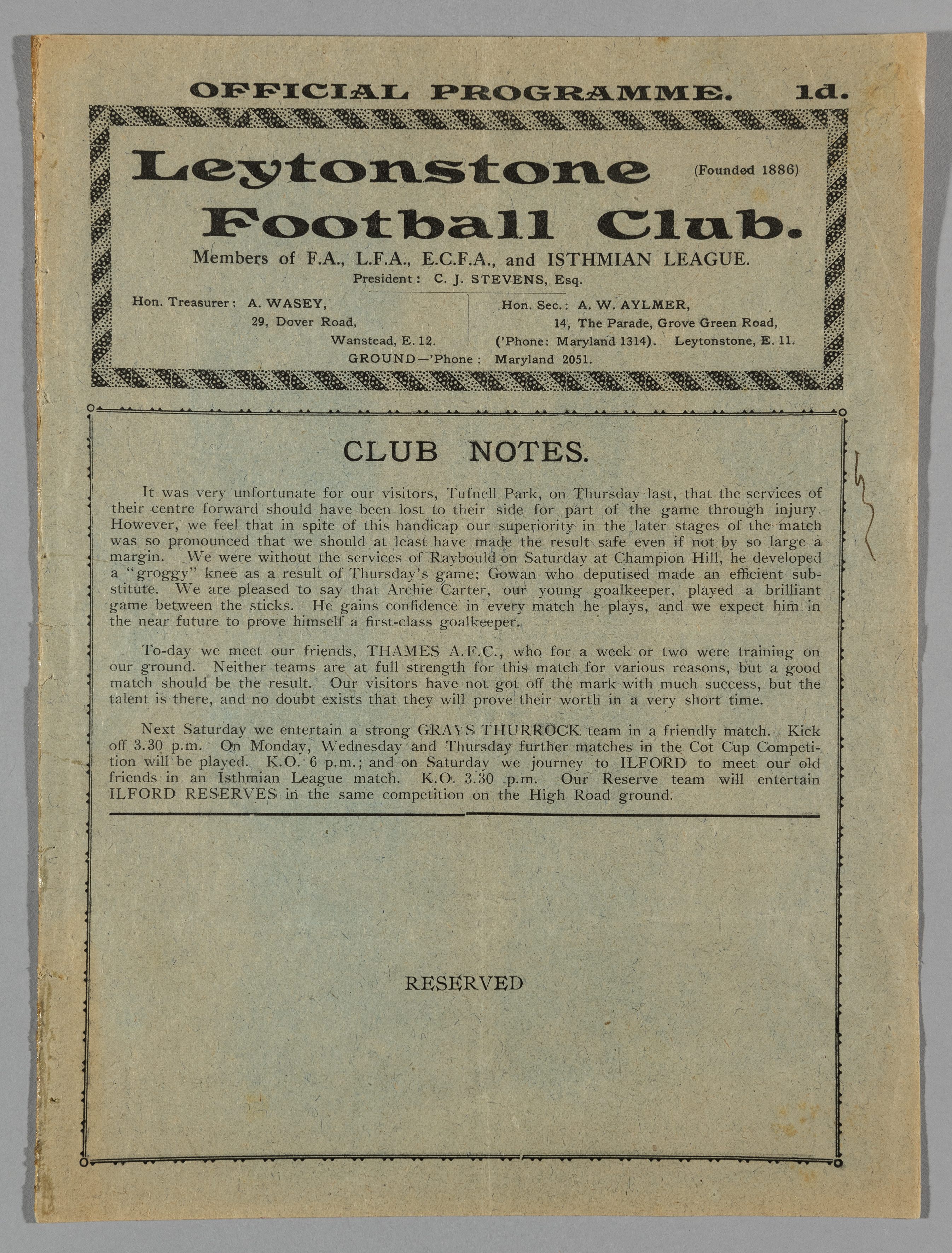 Leytonstone v Thames programme, season 1928-29, for match played on 13th September 1928, the editorial states that Thames who were only formed in August had trained at Leytonstone. It is known that Thames played one league game in the Southern League the week before. Editorial states that both teams were not at full strength, would appear to be a trial friendly, the clubs second ever match