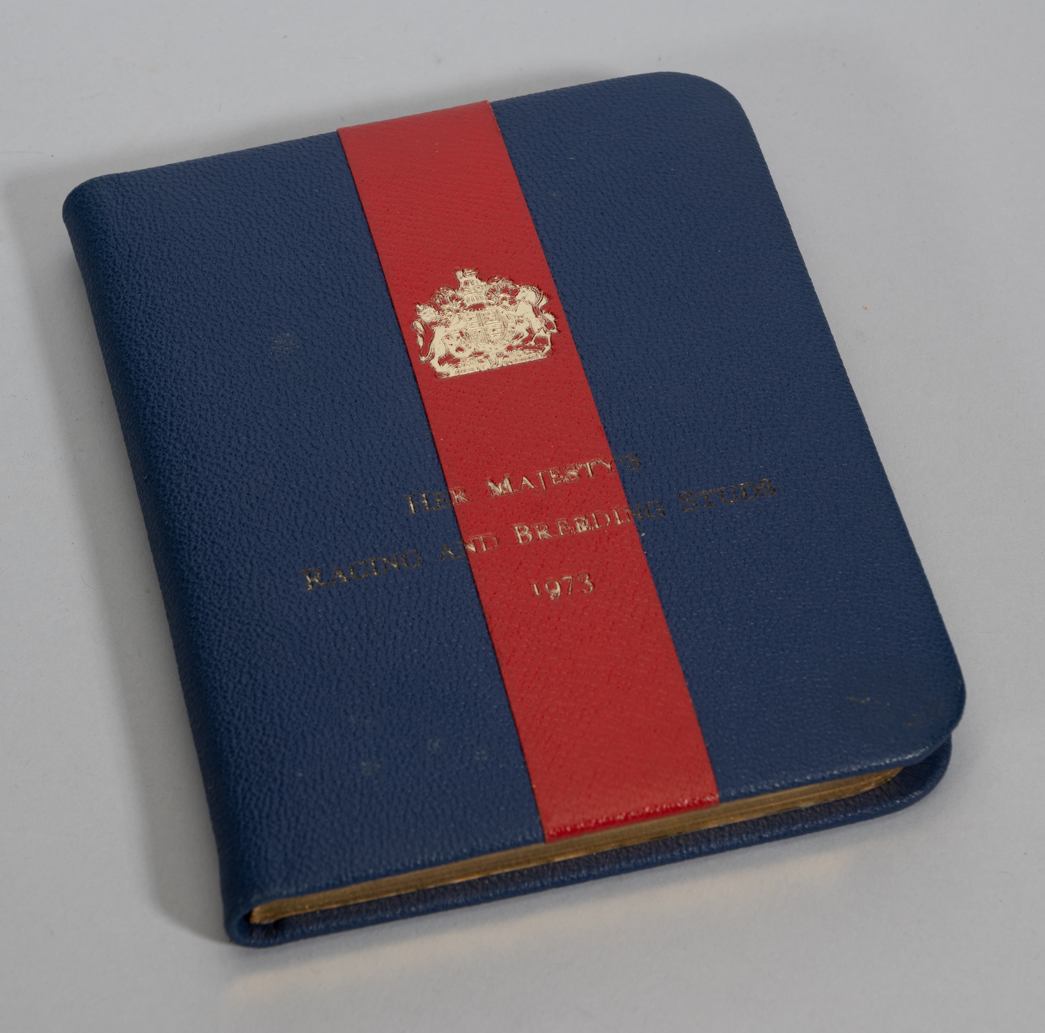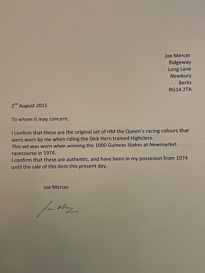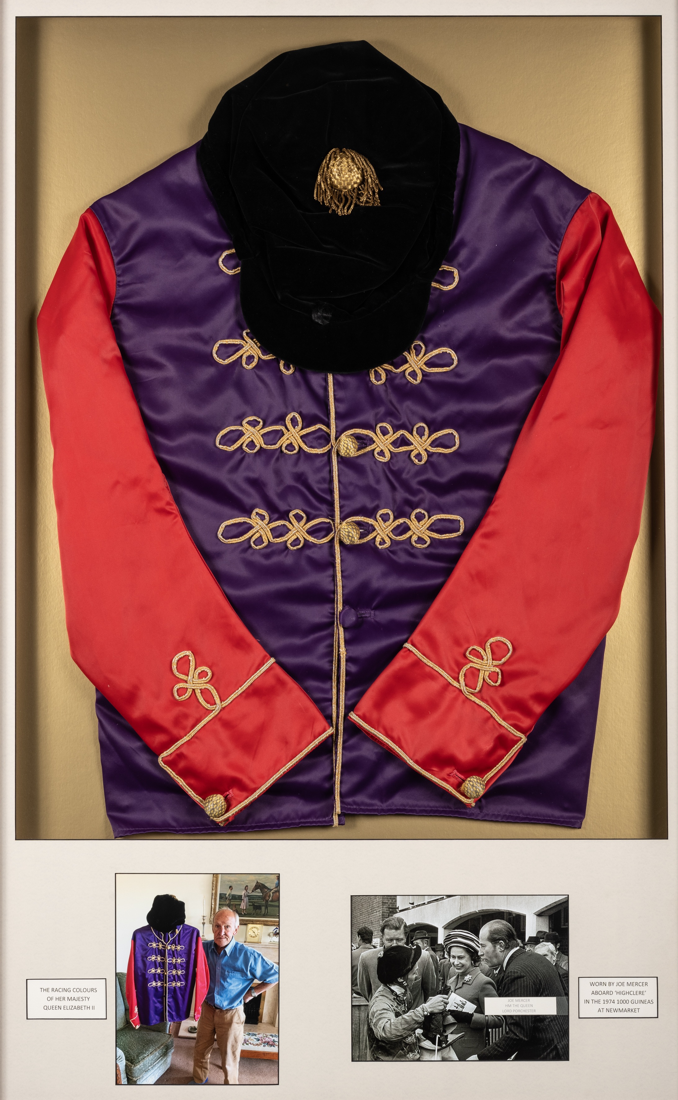 Set of racing silks of HM Queen Elizabeth II worn by Joe Mercer OBE aboard Highclere, when he won the 1,000 guineas at Newmarket on 2nd May 1974, the purple and scarlet silks with gold braiding and buttons, with black velvet cap with gold tassel, mounted above a later colour photograph of Joe Mercer with these silks and a b&w photograph of HM Queen Elizabeth II, with Joe Mercer and Lord Porchester, taken after the race, with typed legend, mounted, glazed and framed, overall 107 by 68cm., with signed letter of provenance from Joe Mercer dated 2nd August 2015 confirming that he wore the silks in 1974, sold with HM Queen Elizabeth II 'Racing and Breeding Studs' book for 1973, navy and red front cover, 120-pages, (3)