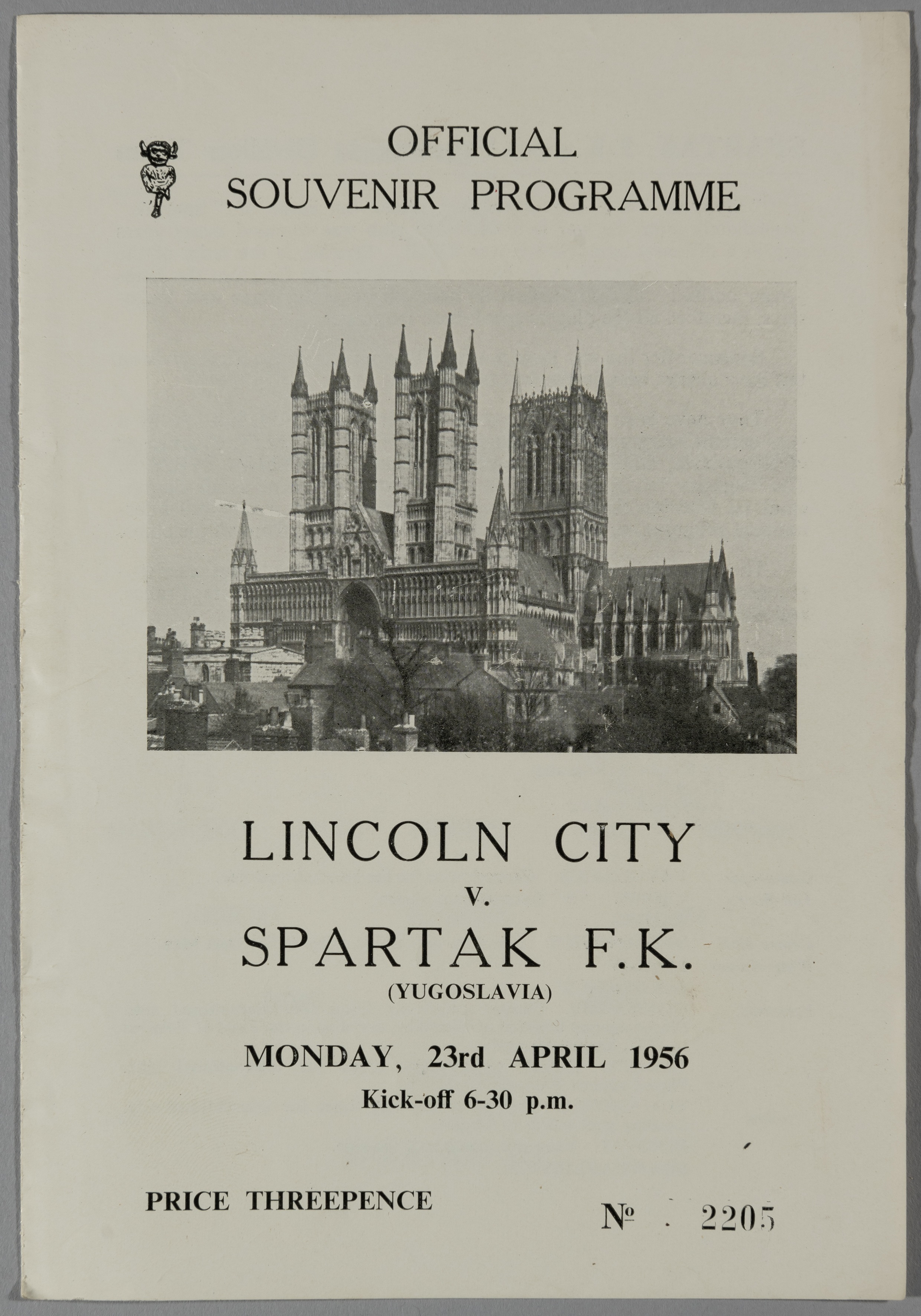 A collection of twenty-nine Lincoln City home programmes dating from 1953 to 1961, including Manchester United (friendly match 12th March 1955) Liverpool (30th October 1955 and FA Cup 3rd round January 8th, 1955) Sheffield Wednesday (September 7th, 1955) Spartak Moscow (April 23rd, 1956) and Leeds United (March 3rd, 1956) (29) Overall condition fair to good. there is evidence of rusting from the staples and also some cover damage and general age-related dirt and slight discolouration. The cover for the game v Stoke City on April 21st, 1956, is missing. The condition of the game v Spartak Moscow is particularly nice.