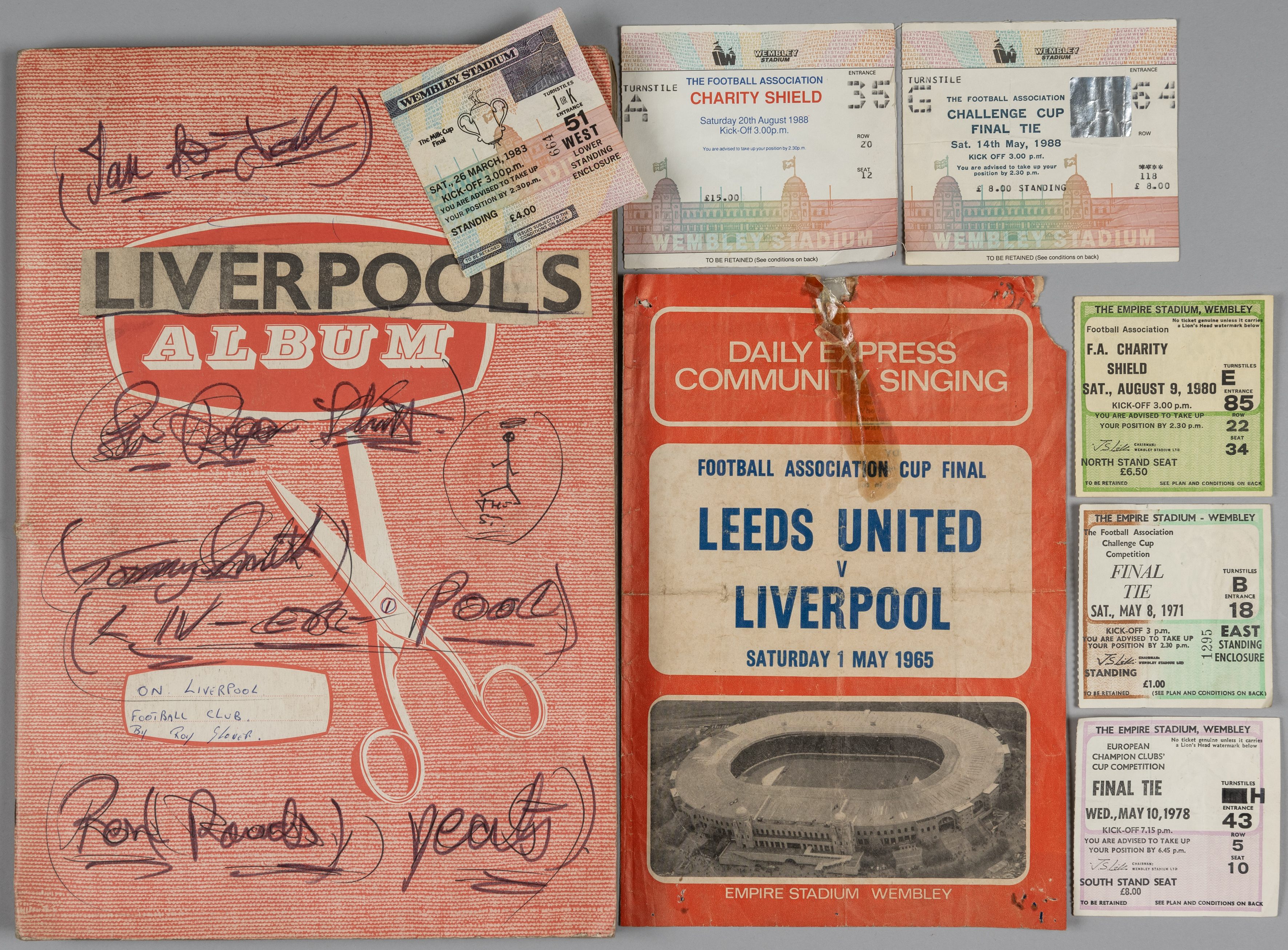 Large box of programmes, scrapbooks, some ticket stubs etc., mostly relating to Liverpool including home and away match programmes from 1960s, stuck into albums, some loose, some later big match programmes etc., (box)