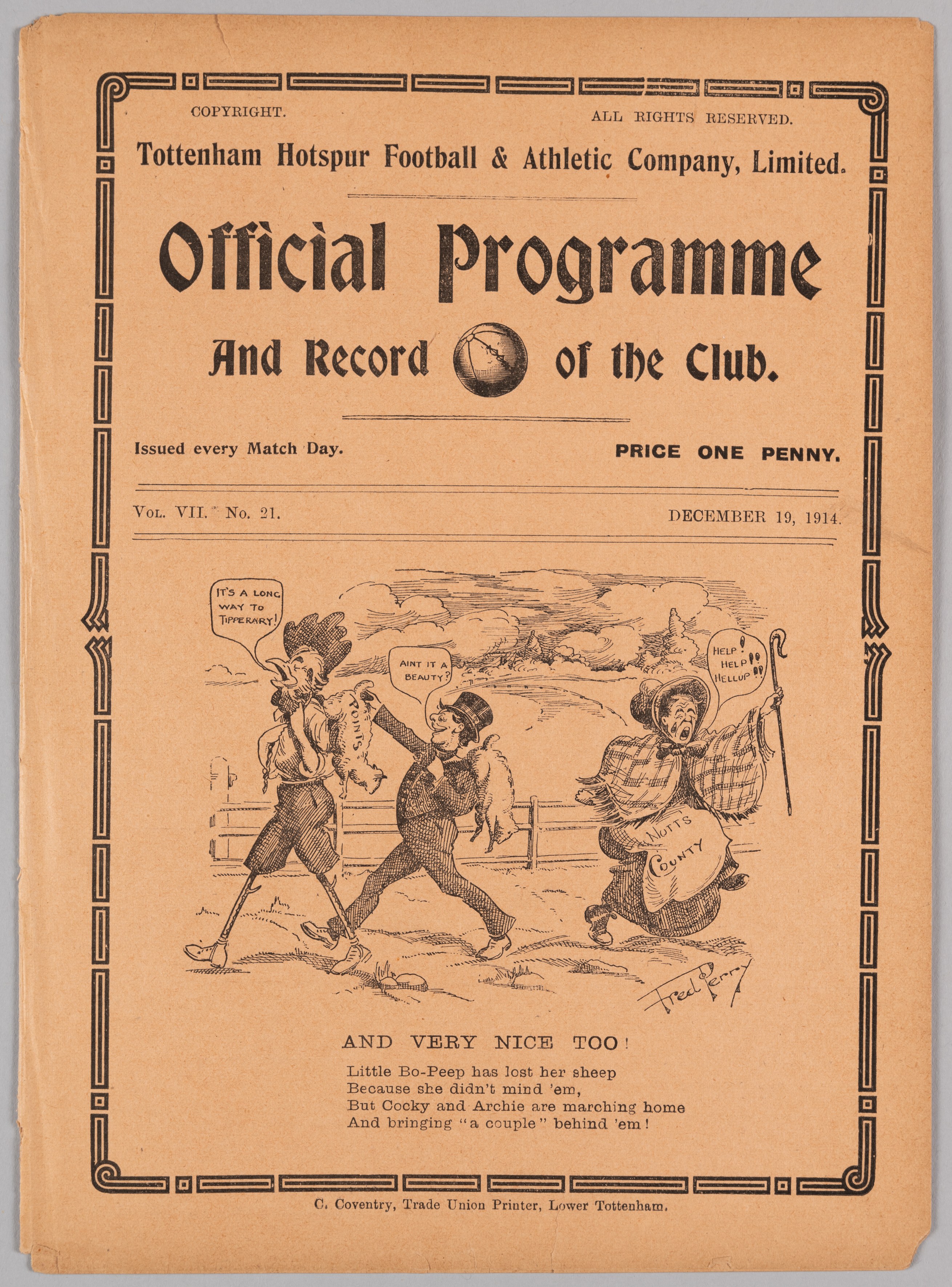 A Tottenham Hotspur v. Sunderland match programme, 19th December 1914, ex bound volume Some creasing in spine, small internal tears