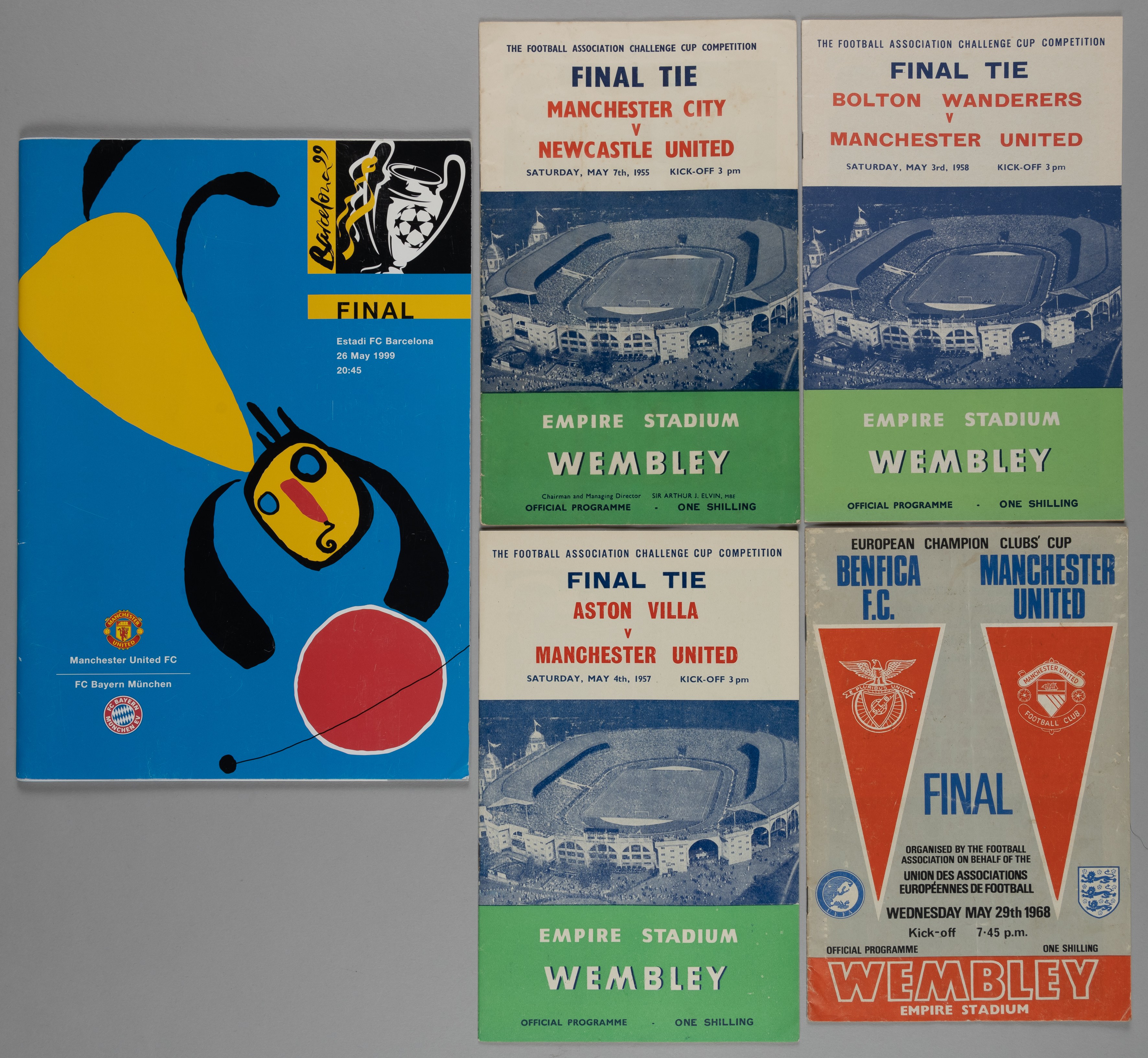 Three Manchester United F.A. Cup final programmes, Newcastle United, 7th May 1955, Aston Villa, 4th May 1957, Bolton Wanderers, 3rd May 1958, Manchester United v. Benfica, European Cup Final match programme, 29th May 1968 and Manchester United v. Bayern Munich, European Cup Final match programme, 26th May 1999 (5)