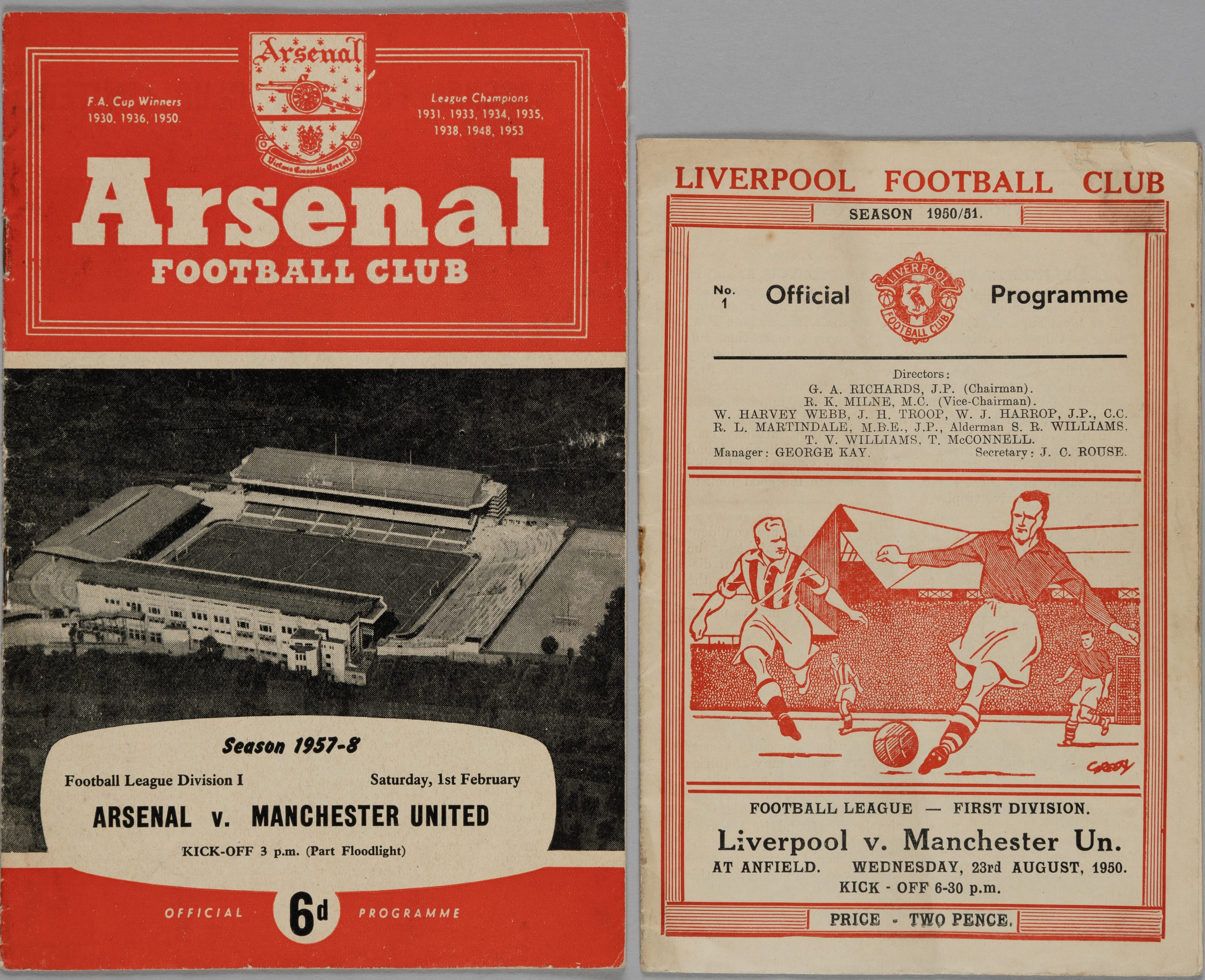 Arsenal v. Manchester United match programme, 1st February 1958, final League match played by the Busby Babes before the Munich Air Disaster and Liverpool v. Manchester United, match programme, 23rd August 1950 (2) Signs of folds