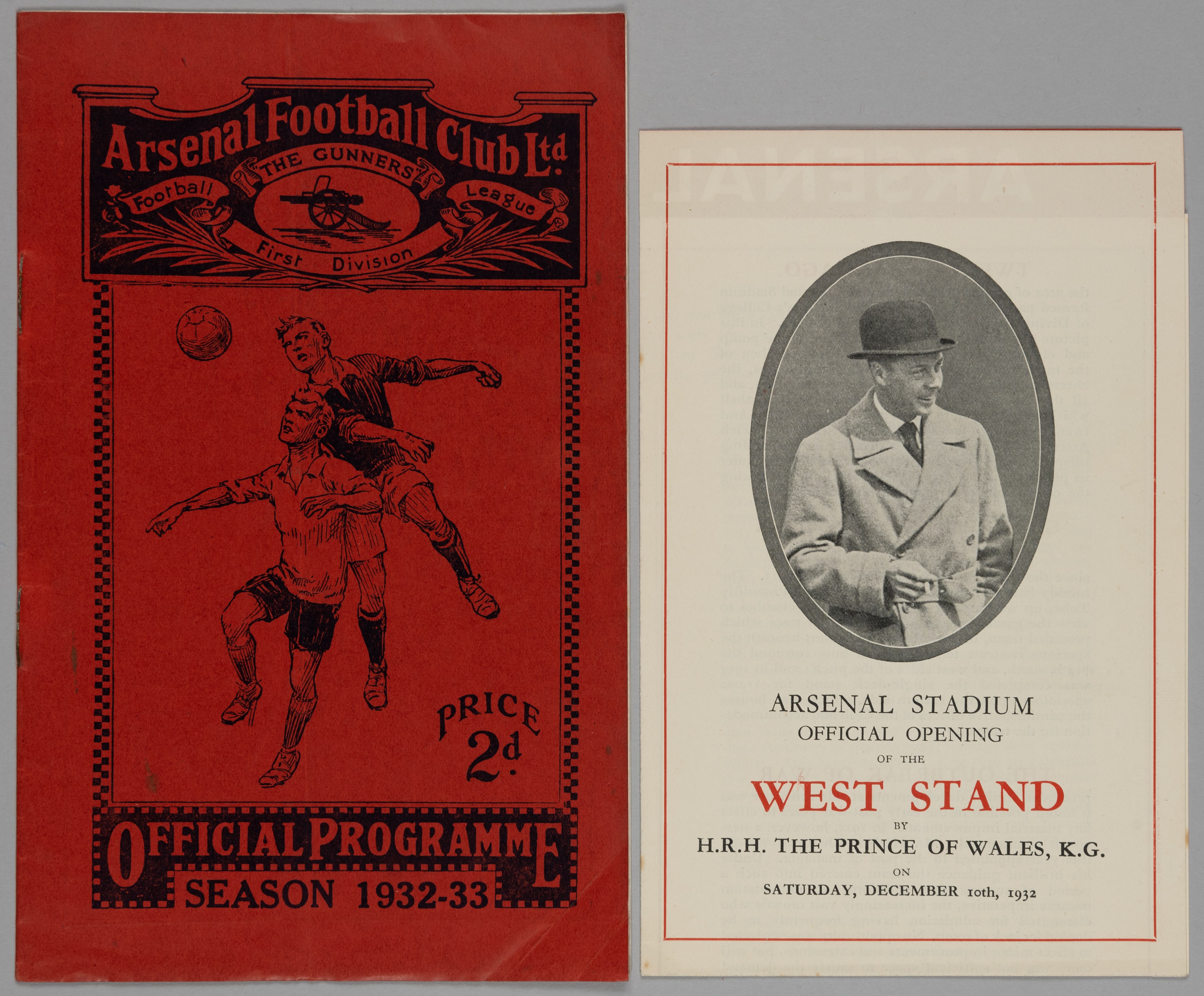 Arsenal v. Chelsea, Opening of West Stand match programme, 10th December 1932, with white fold out leaflet commemorating the stand opening by H.R.H. The Prince of Wales K.G., (2) Signs of vertical fold on programme and leaflet, rusty staples on programme