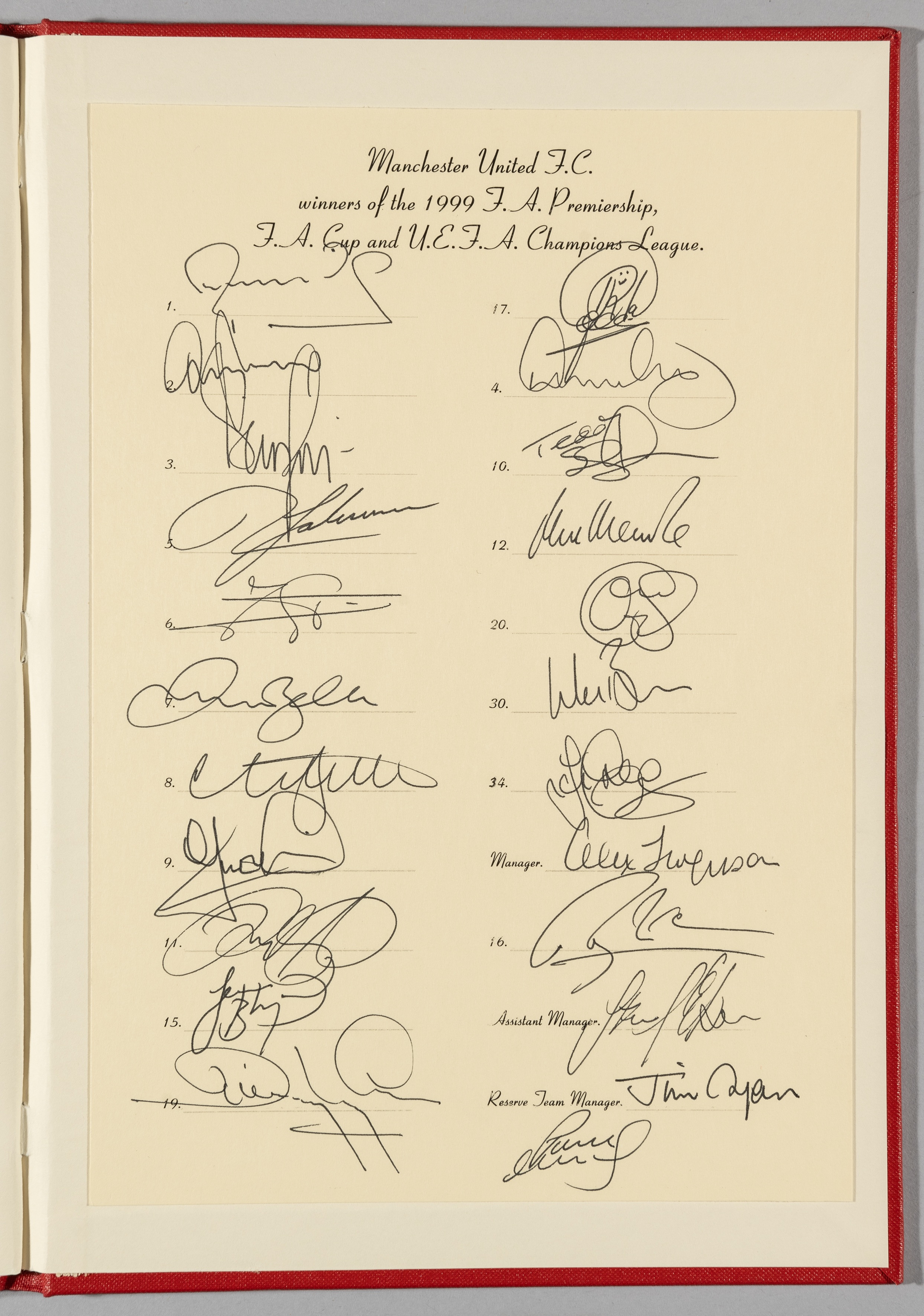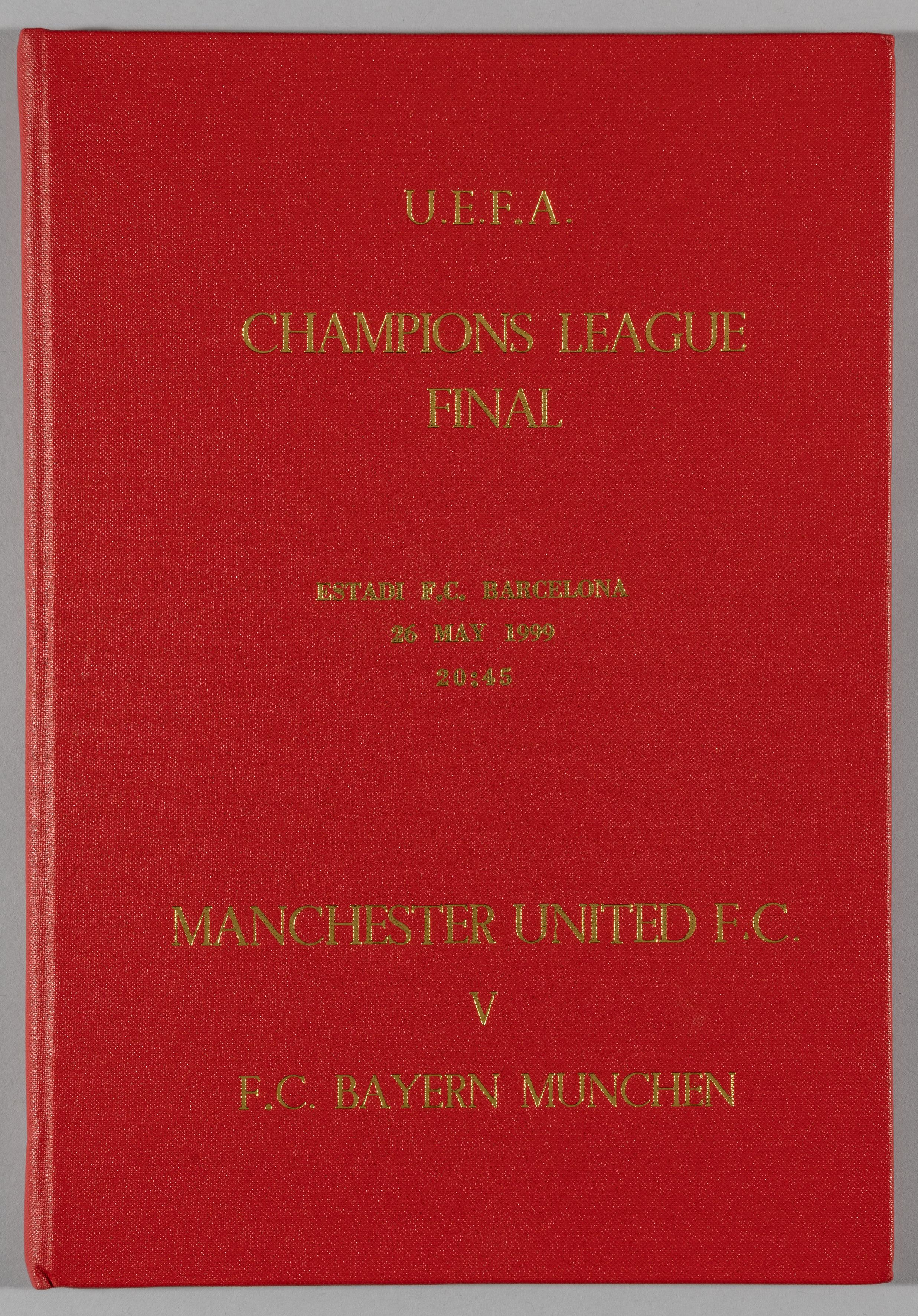 Limited Edition 1999 Champions League Final bound programme between Manchester United v Bayern Munich, played at the Camp Nou, Barcelona on May 26th, hardback with gilt-tooled lettering, the inside cover autographed