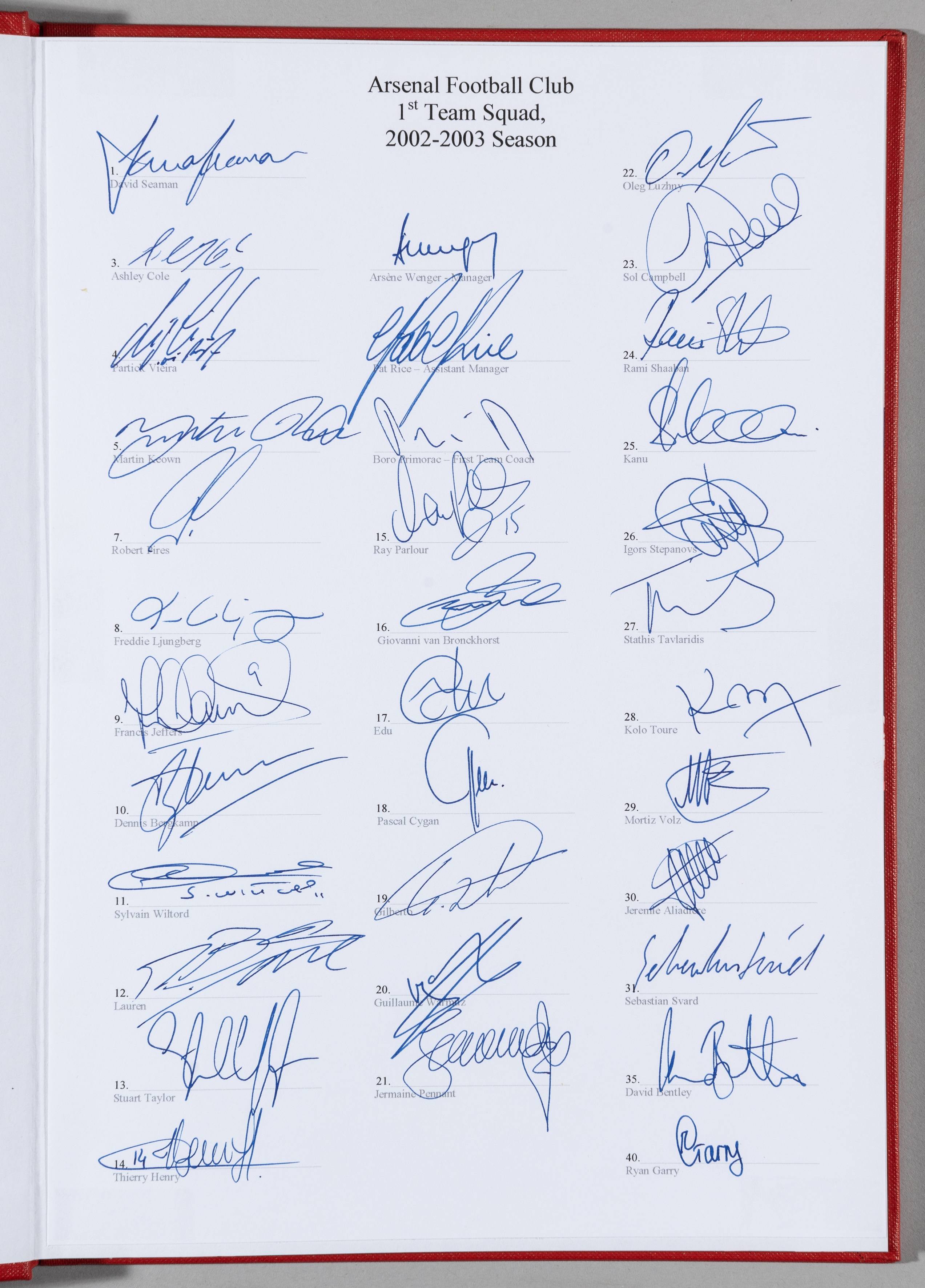 Limited Edition bound programme for the FA Cup Final Game between Arsenal and Southampton 2003, played at Millennium Stadium Cardiff, on Saturday 17th May, hardback with gilt-tooled lettering, the inside cover autographed by the Arsenal team, stuck down