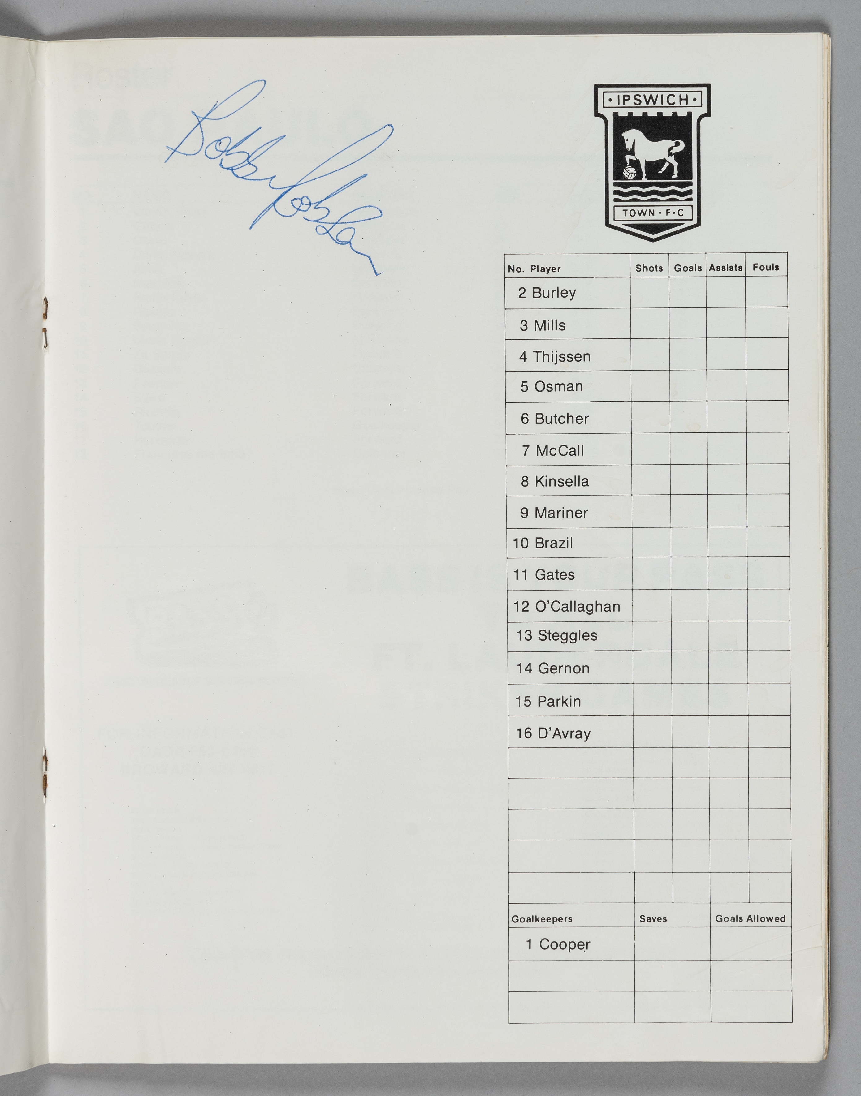 A Tampa Bay Rowdies v. Ipswich Town, Sunshine International Series Tour match programme, 24th July, the team page autographed by Bobby Robson and a
