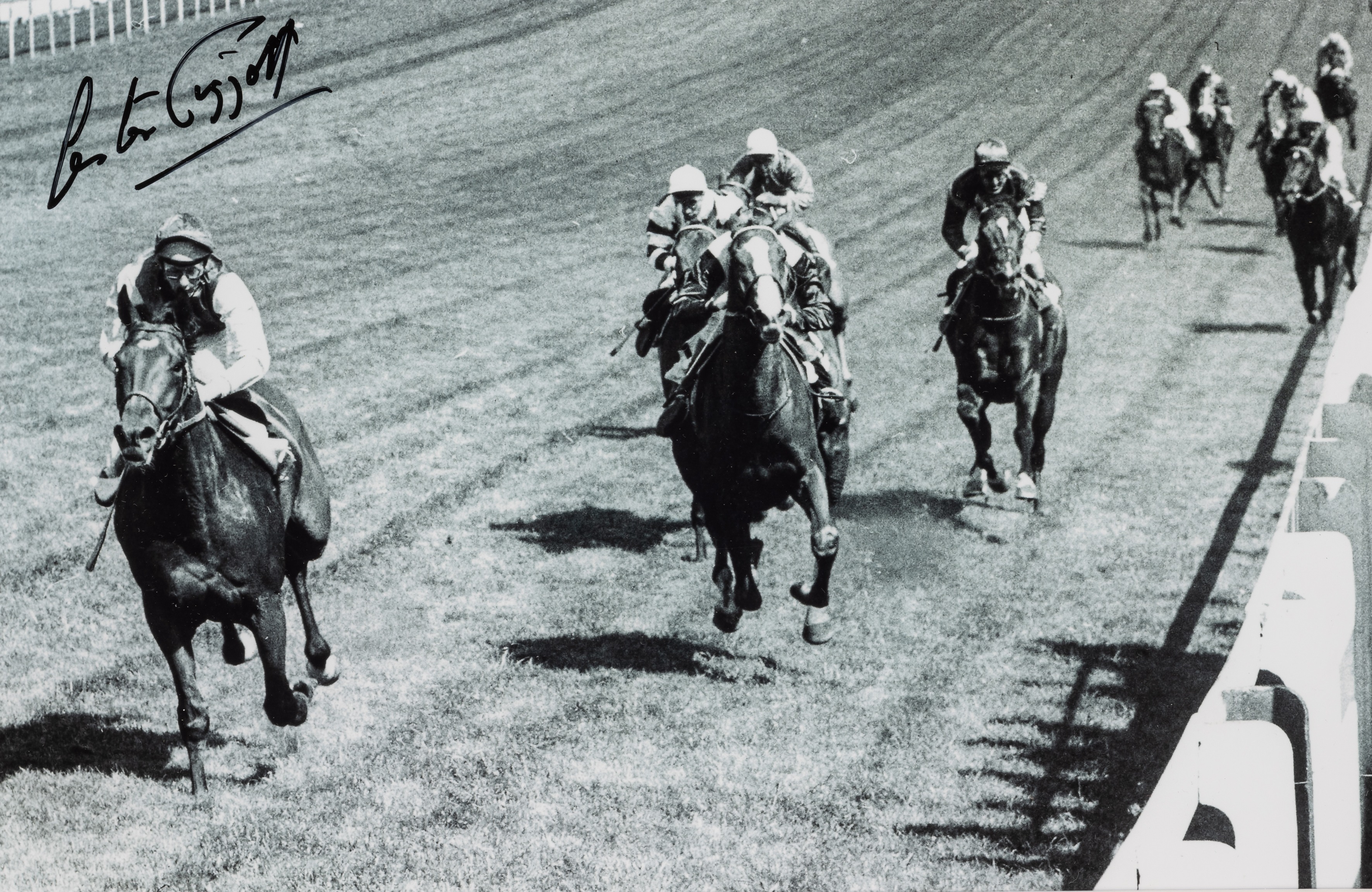 Lester Piggott signed b&w photograph, depicting the legendary jockey passing the winning post aboard Nijinsky in the 1970 Epsom Derby, signed in black marker, 7 1/2 by 11in. photo, mounted, framed & glazed, overall 37 by 47cm. All glass will be removed from framed and glazed items prior to posting and may result in delays to shipping your items. (This service is included in the cost of postage and packing). We can also totally remove all framing and mounts upon request to reduce shipping costs. Alternatively, lots can be collected in person by prior appointment from NN8 1RT.