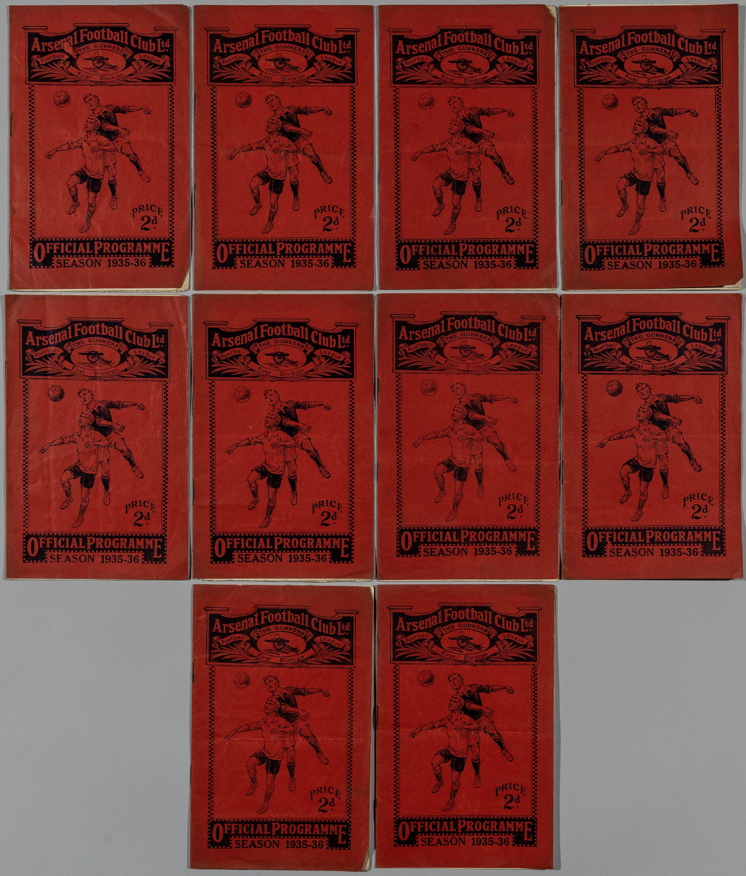 Nine Arsenal home match programmes from 1935-36, comprising Manchester City, 21st September 1935, Blackburn Rovers, 5th October 1935, Preston North