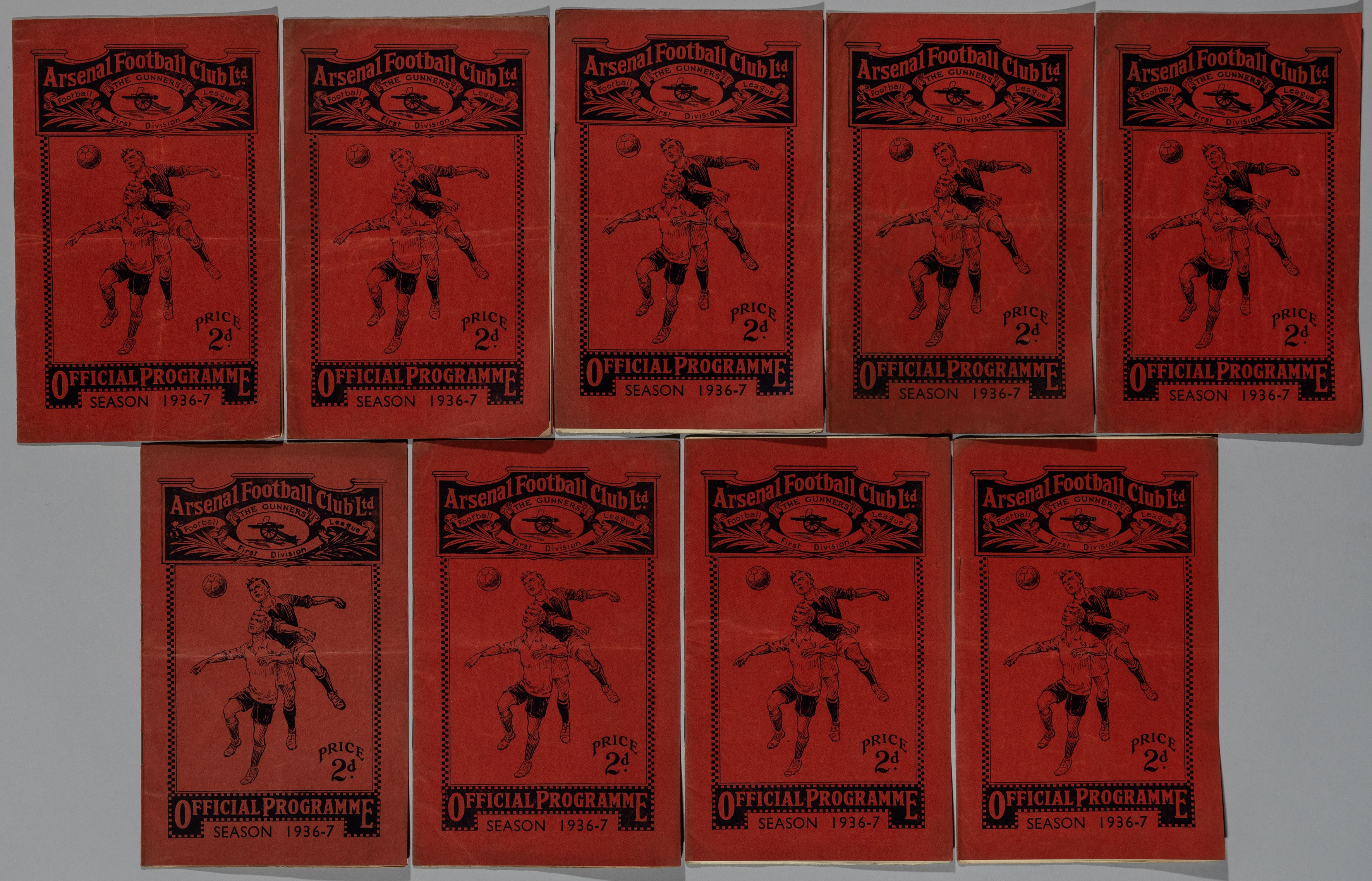 Nine Arsenal home match programmes, 1936-37, comprising Sunderland, 12th September 1936, Derby County. 26th September 1936, Grimsby Town, Inaugurati