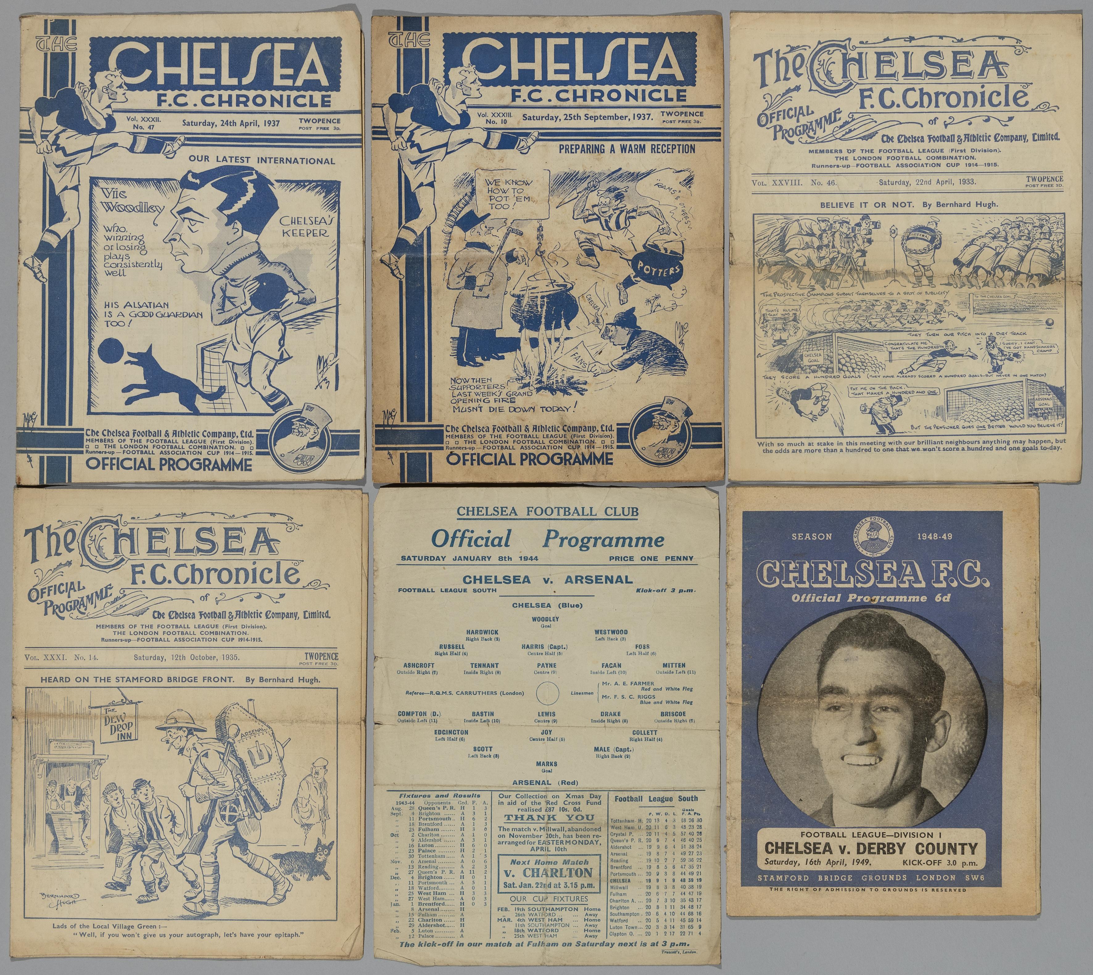 Four Chelsea v. Arsenal home match programmes, 1933-144, comprising 22nd April 1933, 12th October, 1935, 24th April 1937 and 8th January 1944, single-sheet and Chelsea v. Stoke City, 25th September 1937 and Chelsea v. Derby County, 16th April 1949, (6) All programmes with signed of folds, staining and yellowing, single sheet with tears to edges