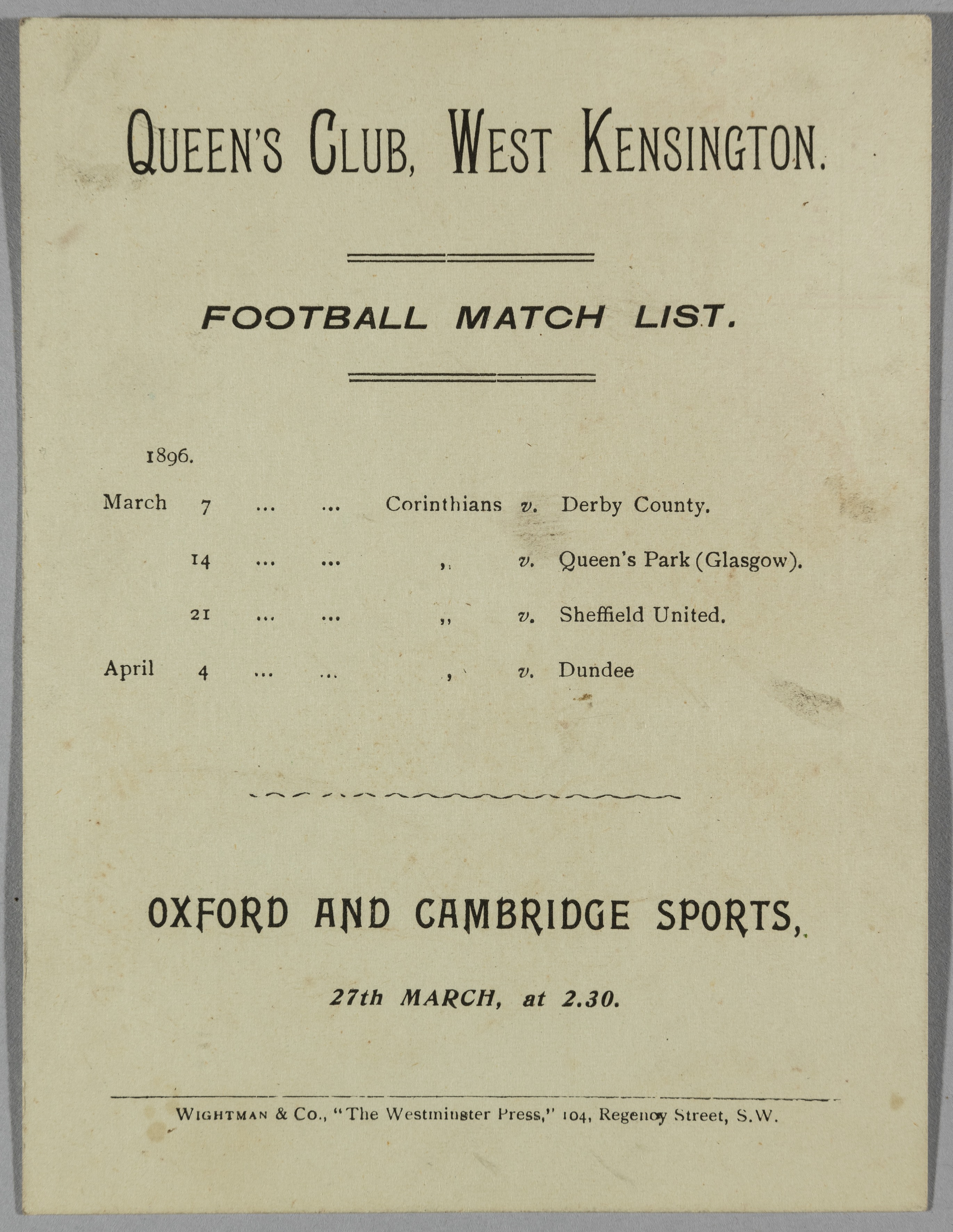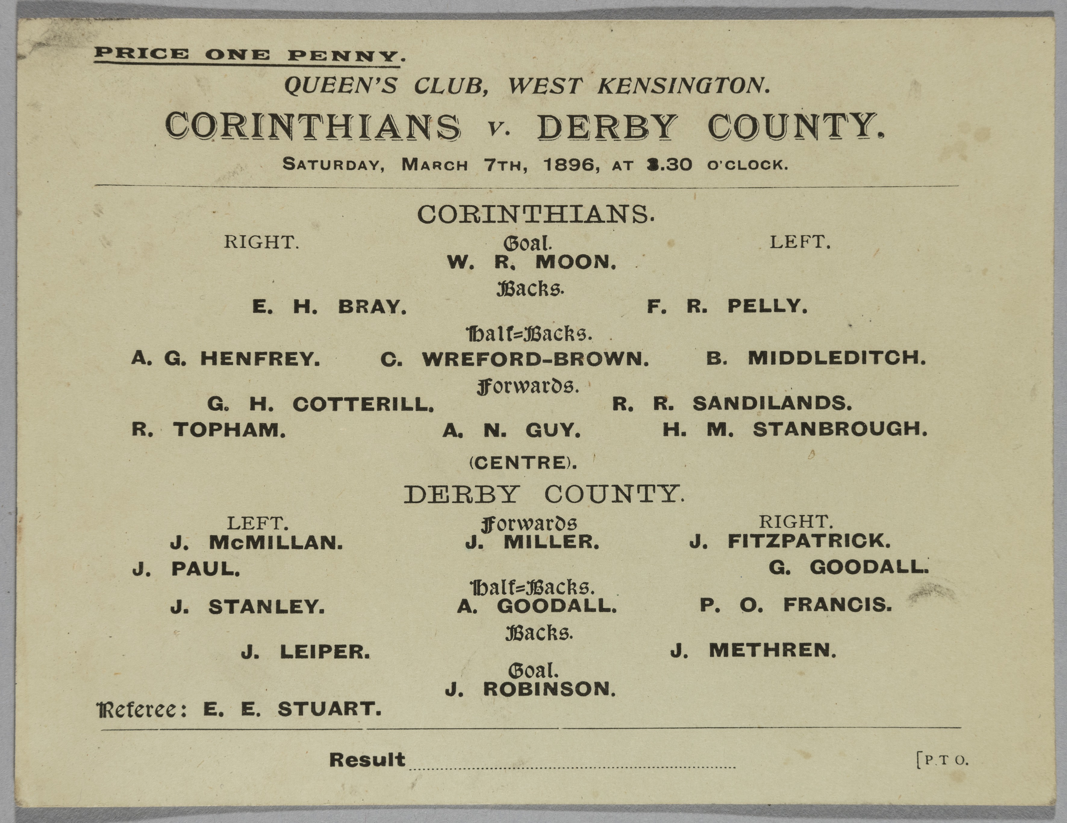 Corinthians v Derby County programme played at Queen's Club, West Kensington, 7th March 1896, match card good condition