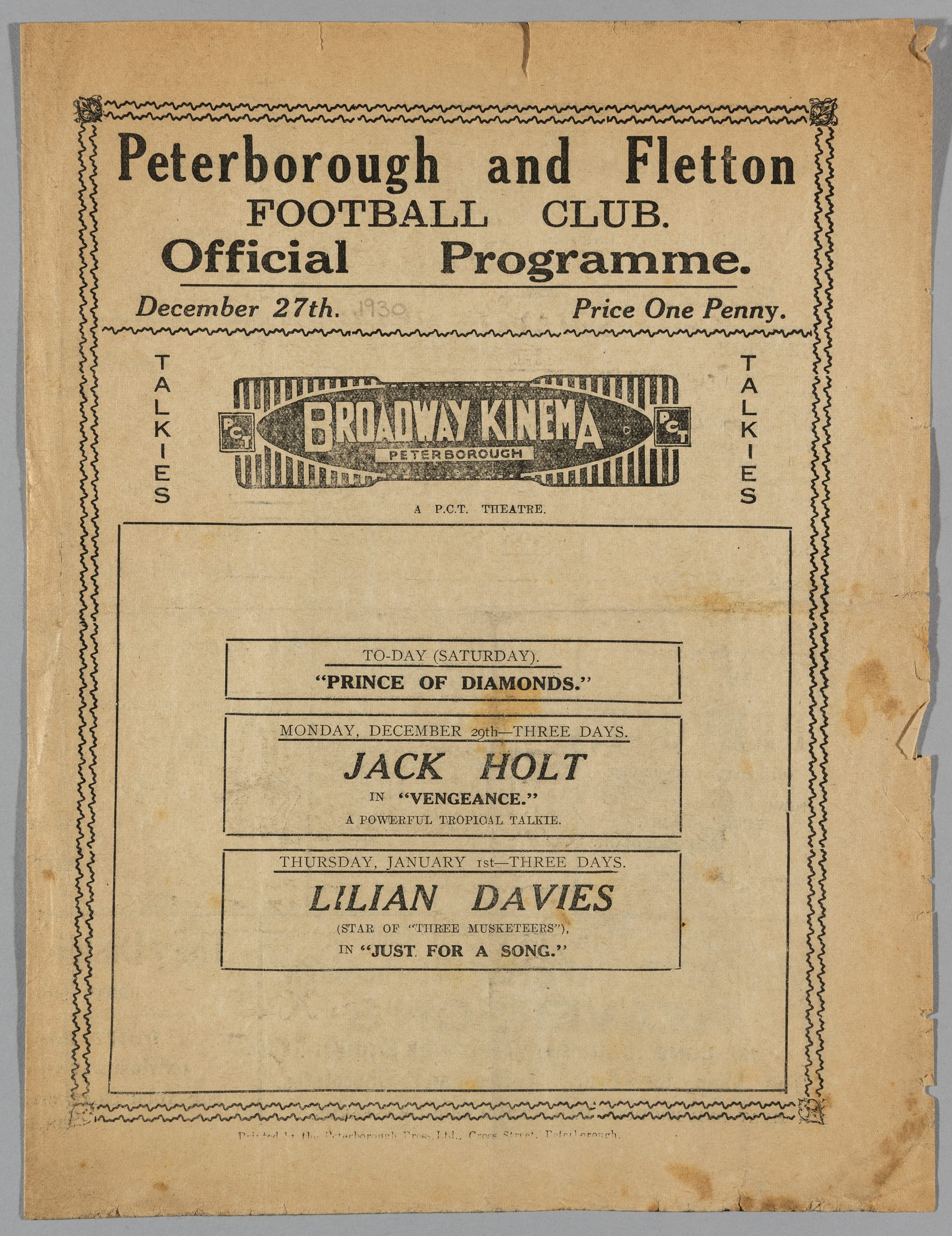 Peterborough and Fletton United v Thames programme played at London Road 27th December 1930, London Combination fixture, 4-page some marks and tea