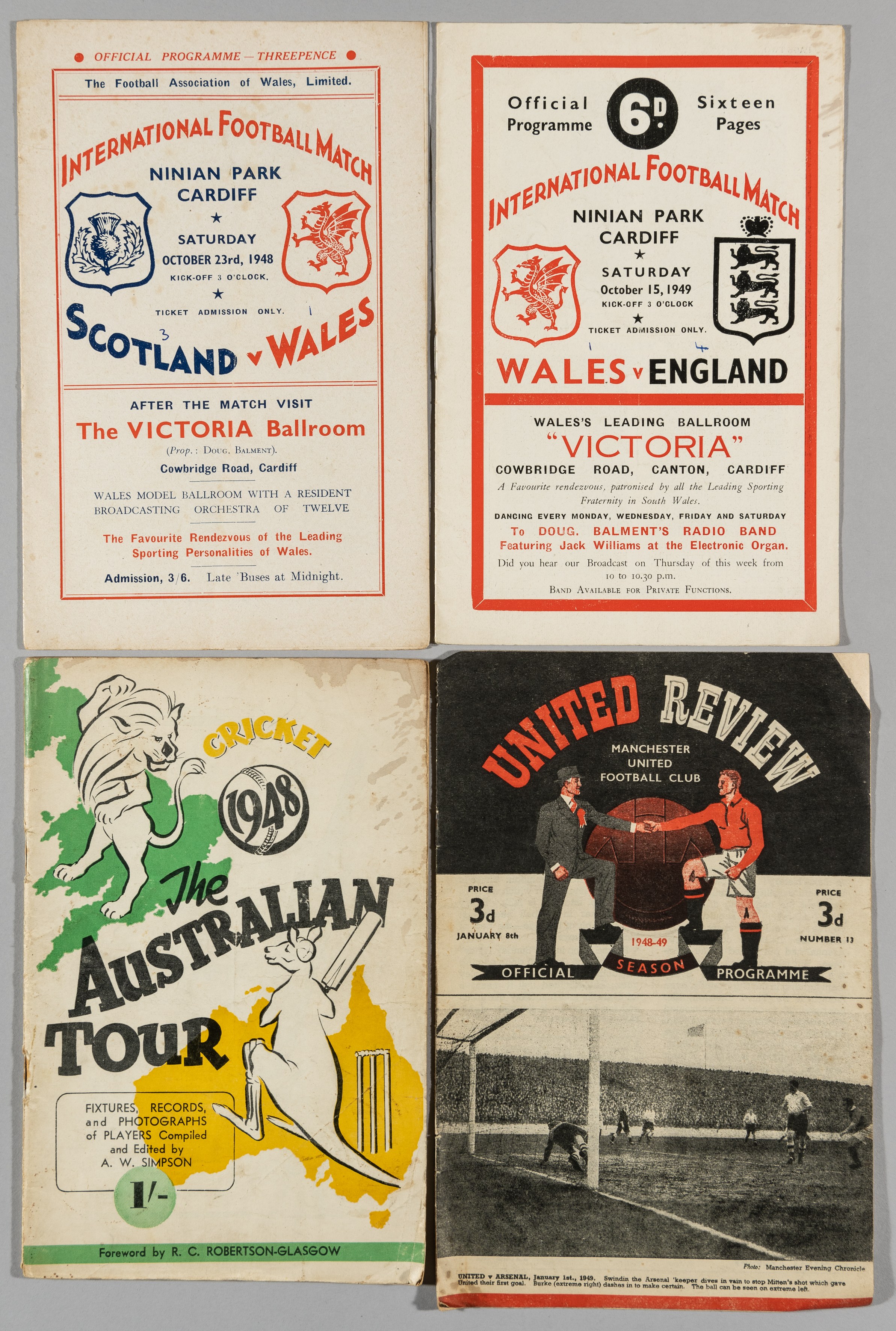 A collection of English, Welsh domestic and International match programmes from late 1940s, including Manchester United v. Charlton Athletic, 30th August 1947, Bournemouth, 8th January 1949, Tottenham Hotspur v. Sheffield Wednesday 30th March 1957, Wolves, 27th September 1958, 25th April 1953, Scotland v. Wales 23rd October 1948, Wales v England, 15th October 1949 etc and 1948 The Australian Tour programme (a lot)