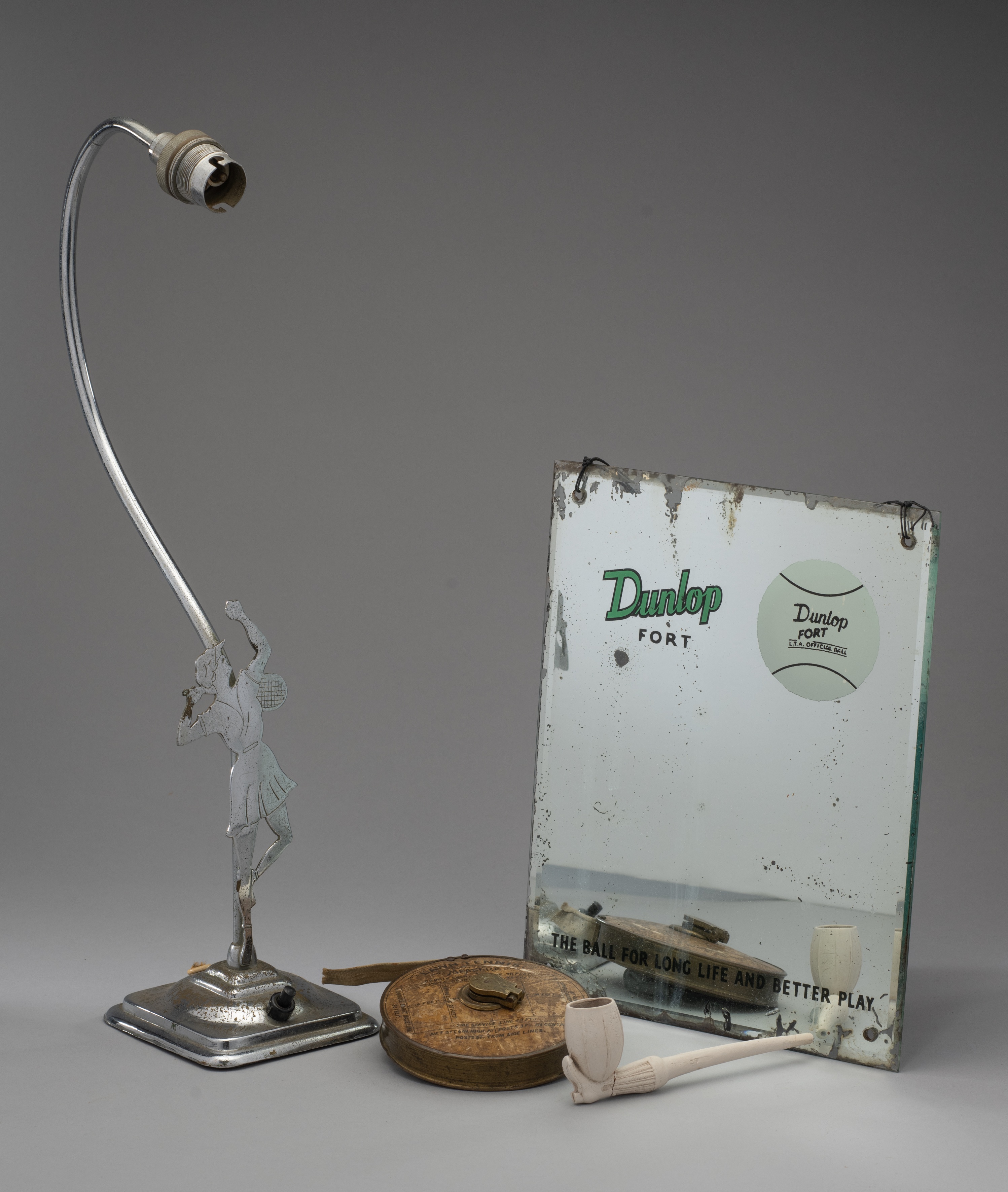 Collection of Tennis related items, includes chrome plated Art Deco table lamp with stylised tennis figure, Clay pipe, Fort Dunlop Advertising mirro