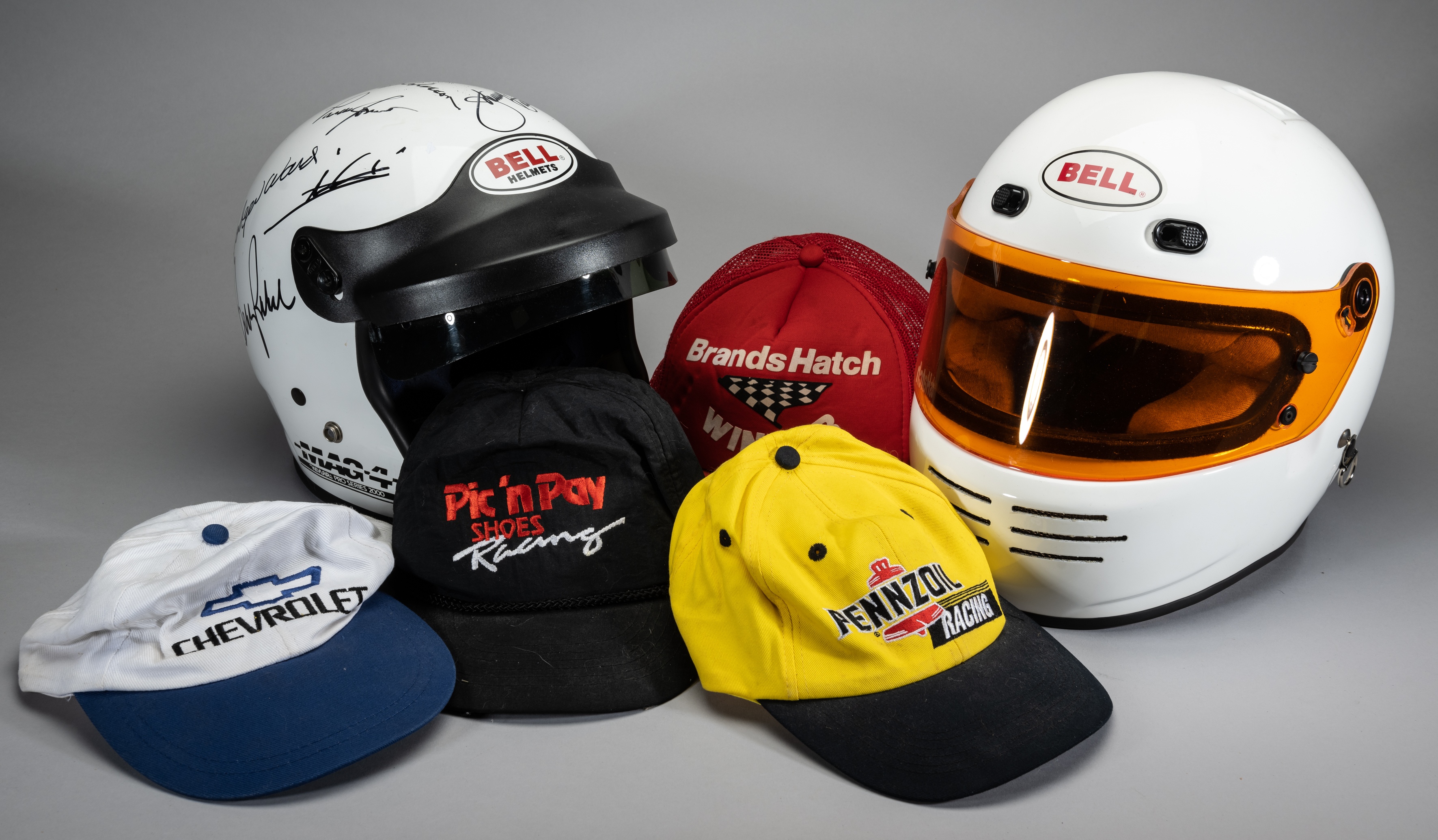 A Bell Mag 4 Kevlar Pro Series 2000 autographed helmet and another Bell crash helmet, twenty-two various motor sports baseball caps including Daytona 500 examples, (qty)