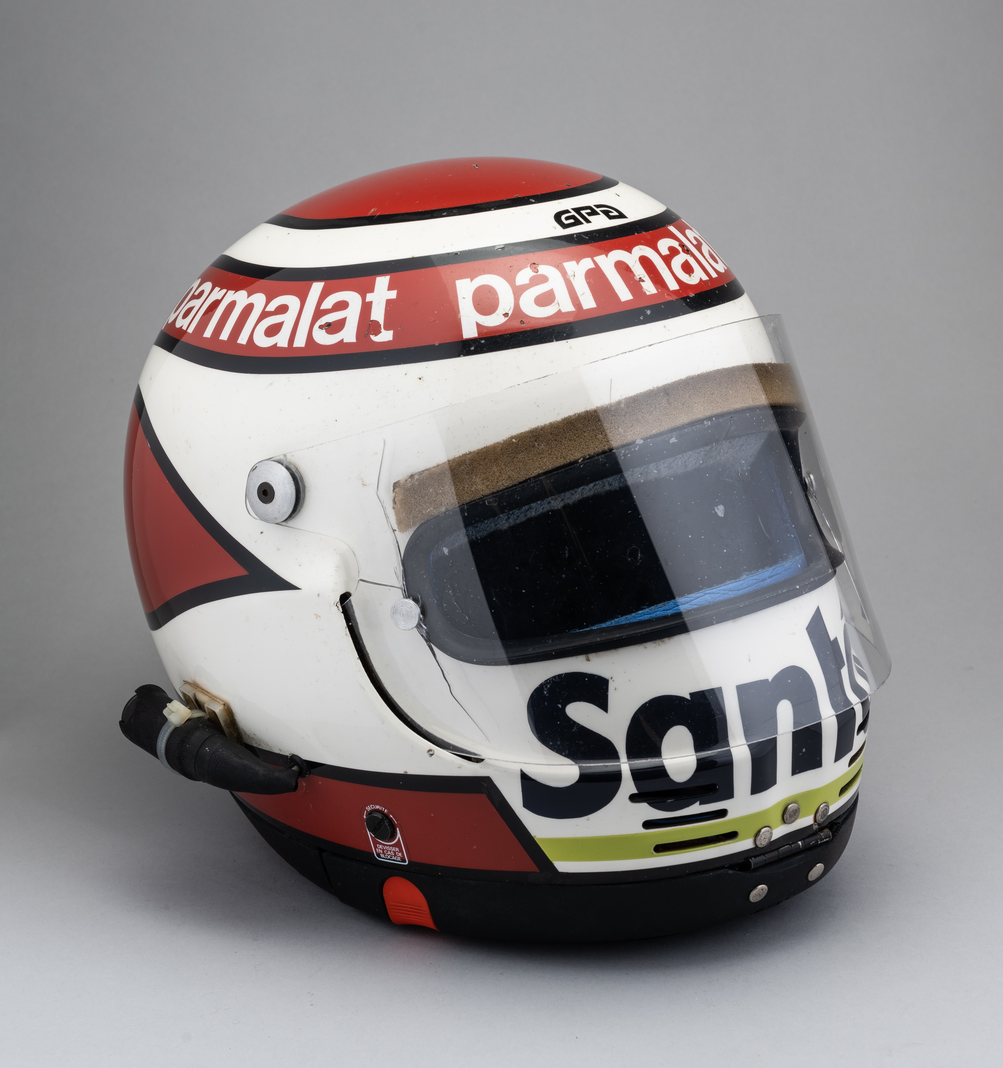 Nelson Piquet race worn F1 Snell helmet, Serial No.A0278623, the white, red and black coloured helmet bearing PARMALAT, SANTAL, GPD decals, with cle