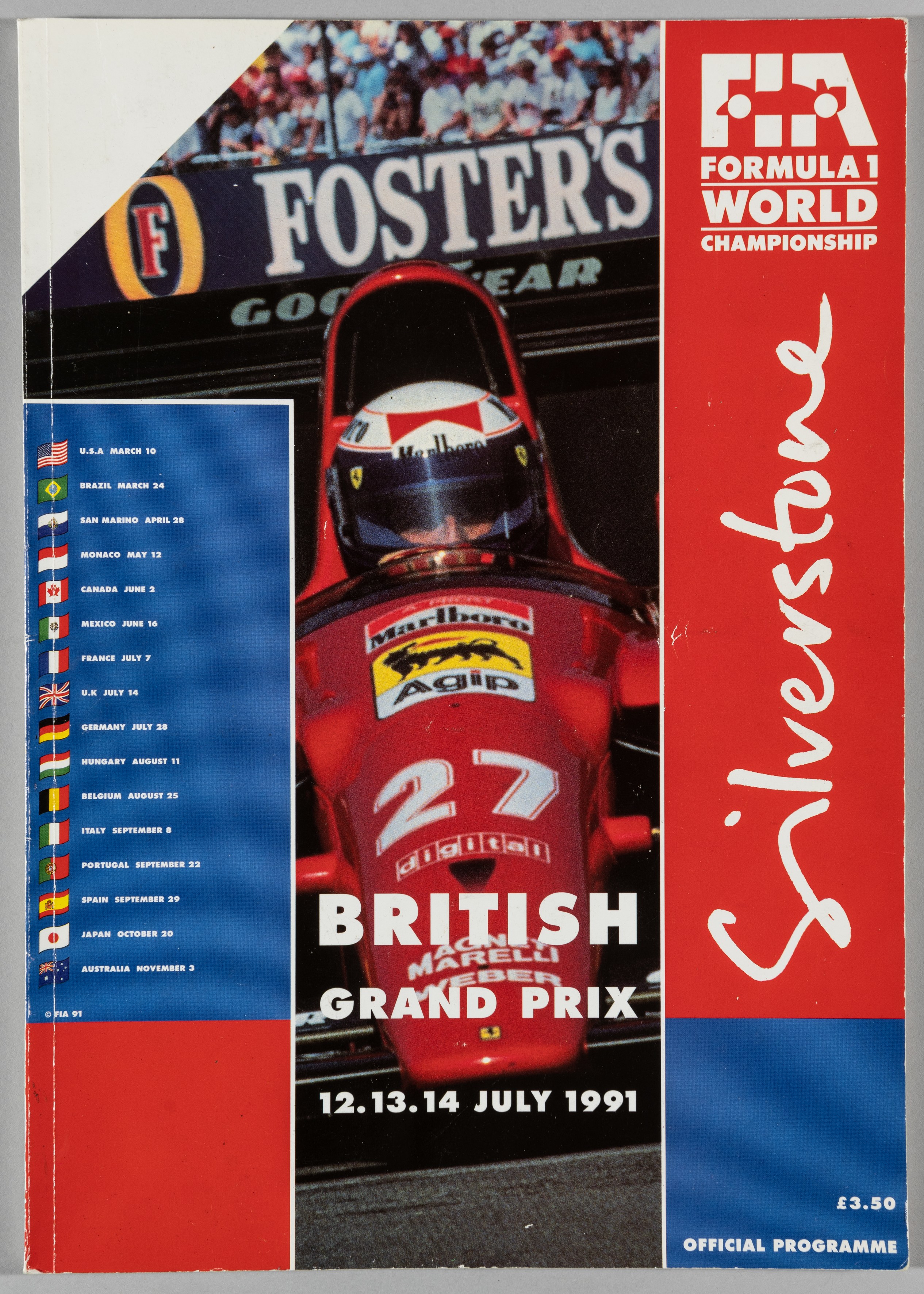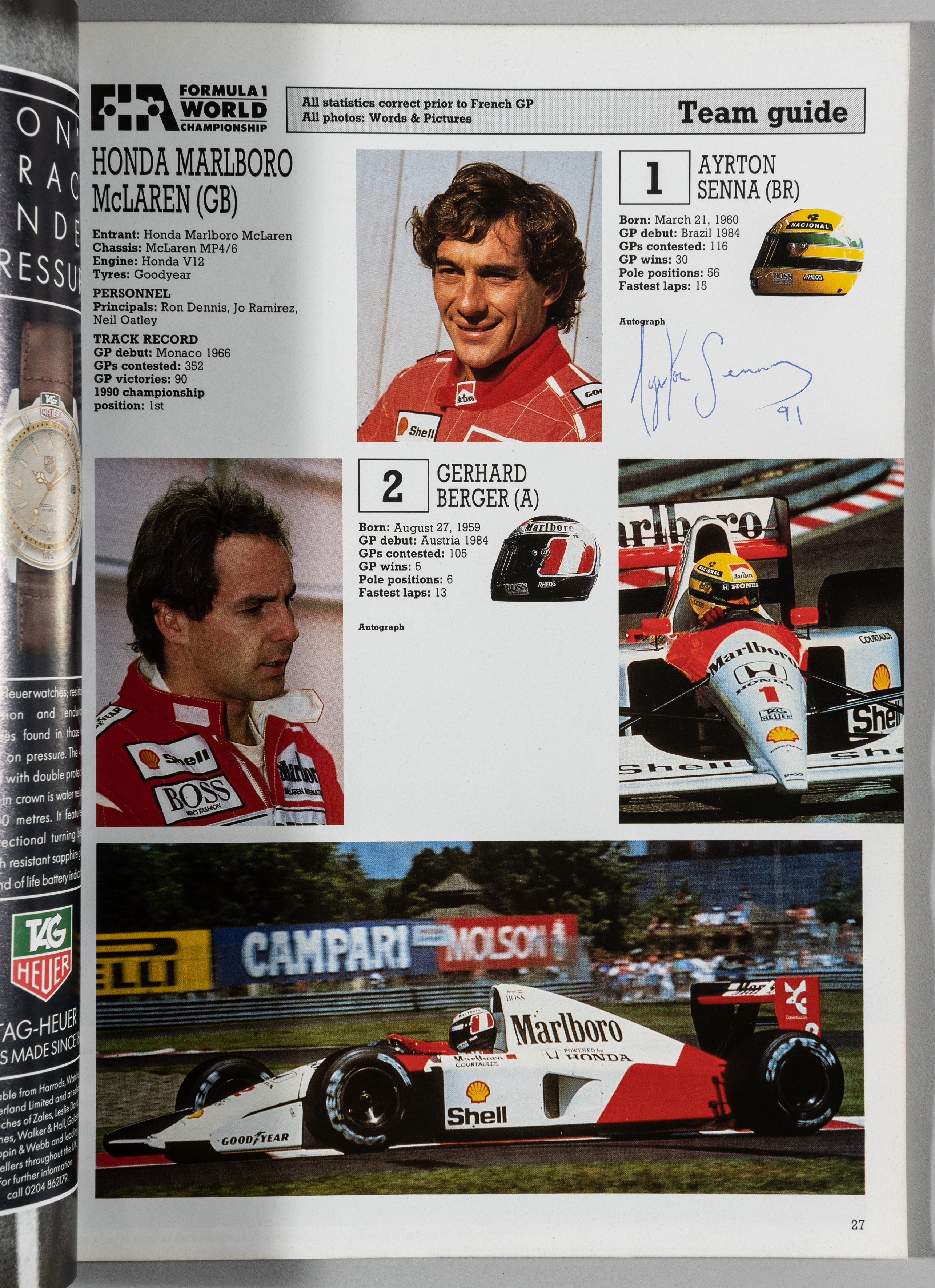 Ayrton Senna signed British Grand Prix programme, held at Silverstone on 12th to 14th July 1991, programme for F1 World Championship in the year that Ayrton Senna became World Champion, signed on team guide page 27 in blue ink, 106-page with cover Condition good with minor wear to exterior edges and spine of cover