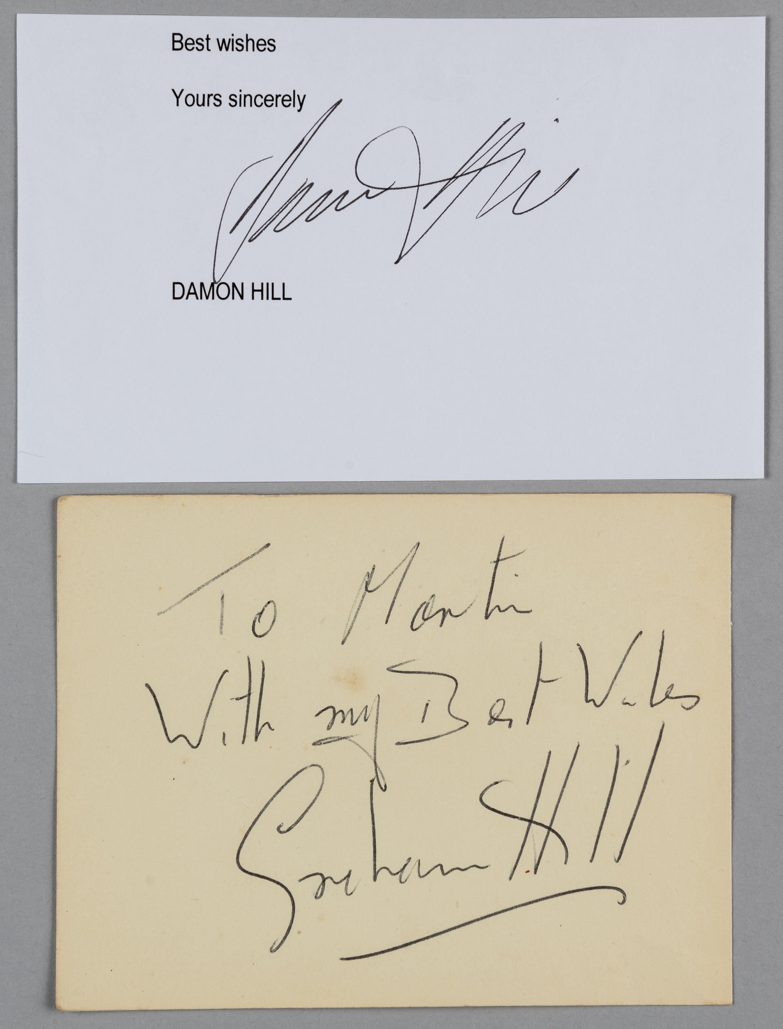Graham Hill (1962 & 1968) & Damon Hill (1996), father and son Formula One World Championship winning drivers - good pair of original ink autographs,
